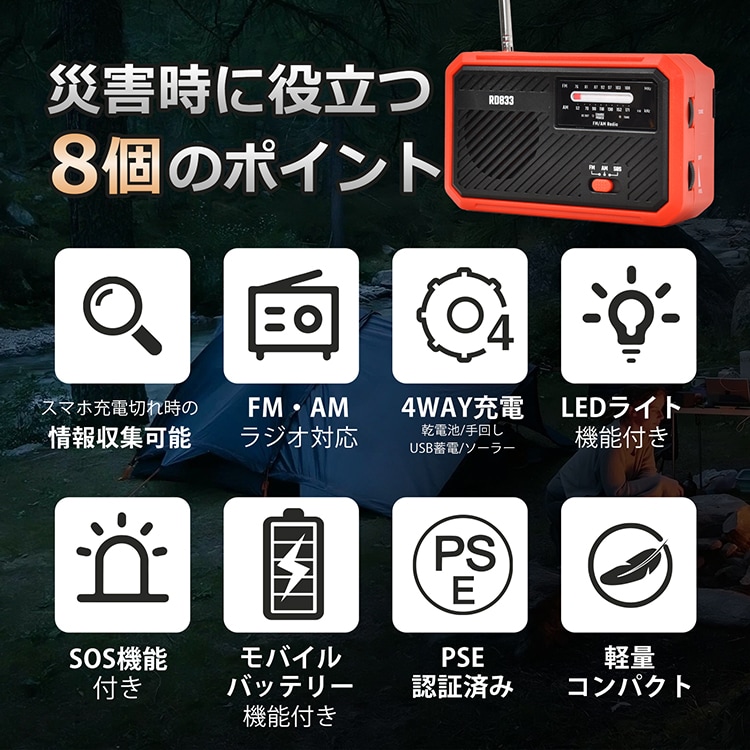 【充電方法】:乾電池/手回し/ USB蓄電/ソーラー