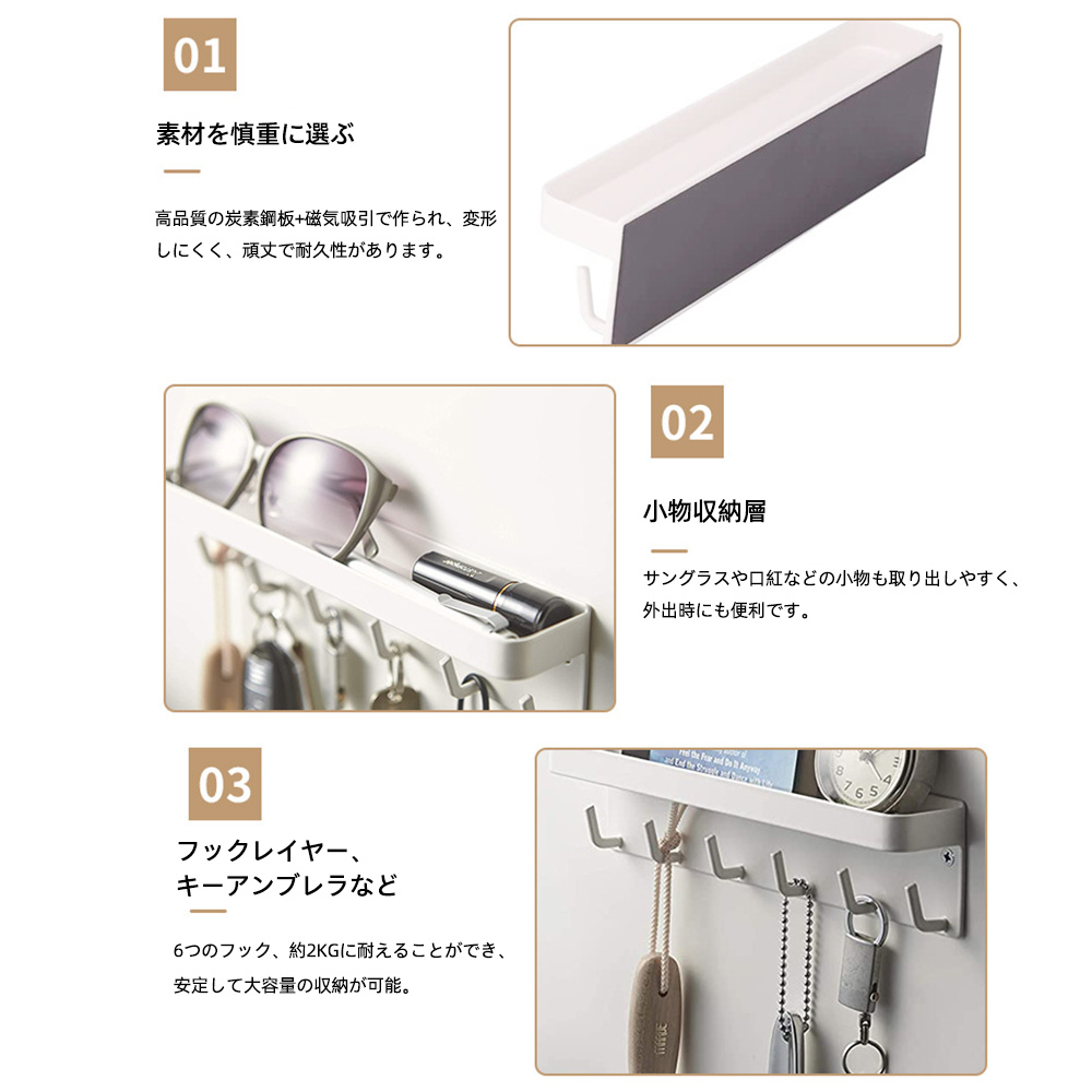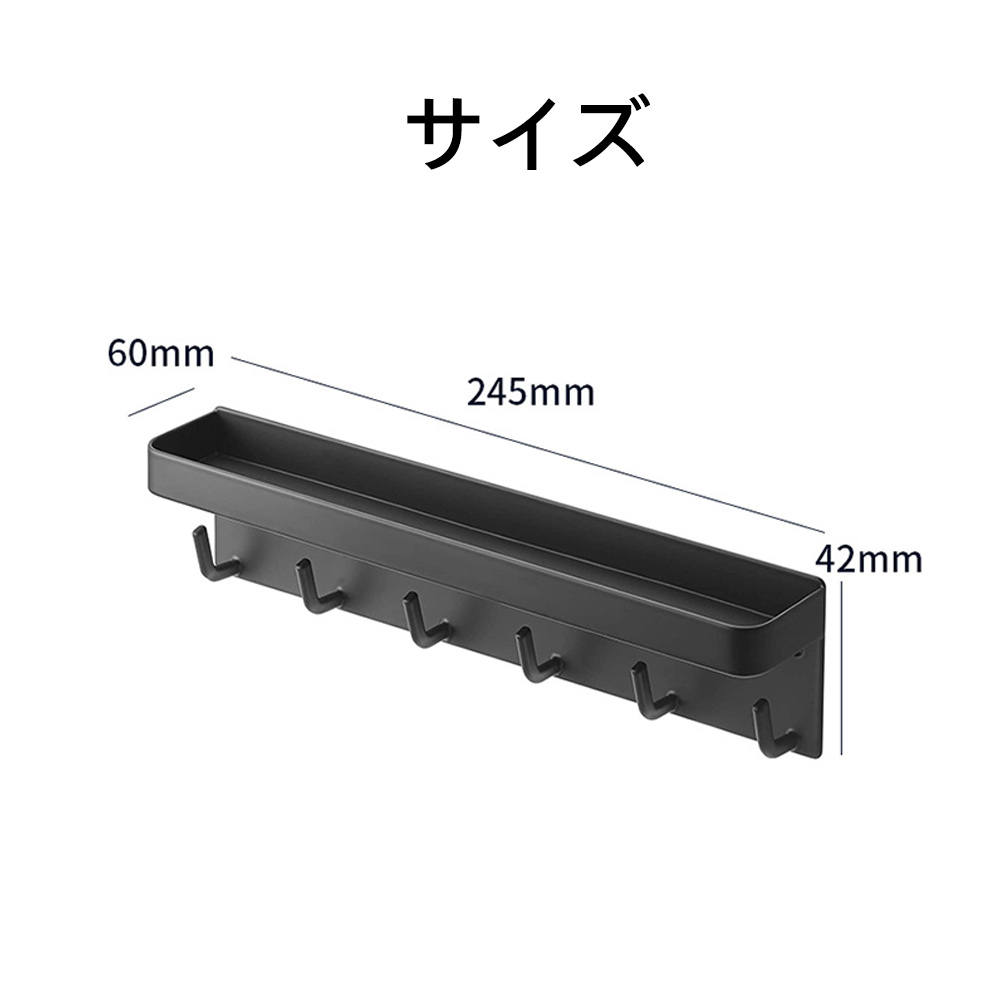 「マグネットフック・サイズ」245x60x42mm、強力なマグネットが付いて、最大荷重は2.5kgです。キー、傘、フライ返し、エッグビーター、ヘッドフォン、手袋、帽子、スカーフ、雑巾、ブラシ、バッグ、もとゆいなどものが収納できます。