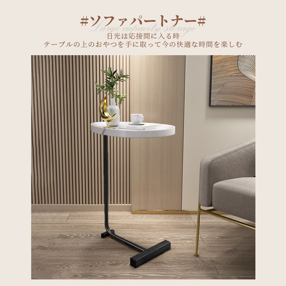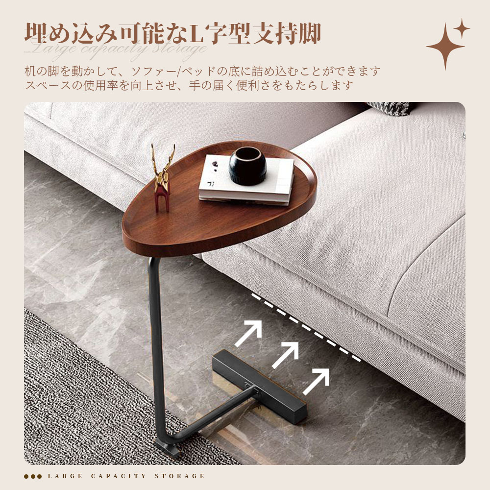 天板の角が丸く加工されているので、角をが痛くて使いにくいといった心配はありません。ソファに差し込めるから、座りながらのティータイムも快適に過ごせる。ソファやベッド、テーブルの傍らに。いつもそばに置いておきたい、様々なシーンで役立つサイドテーブル。