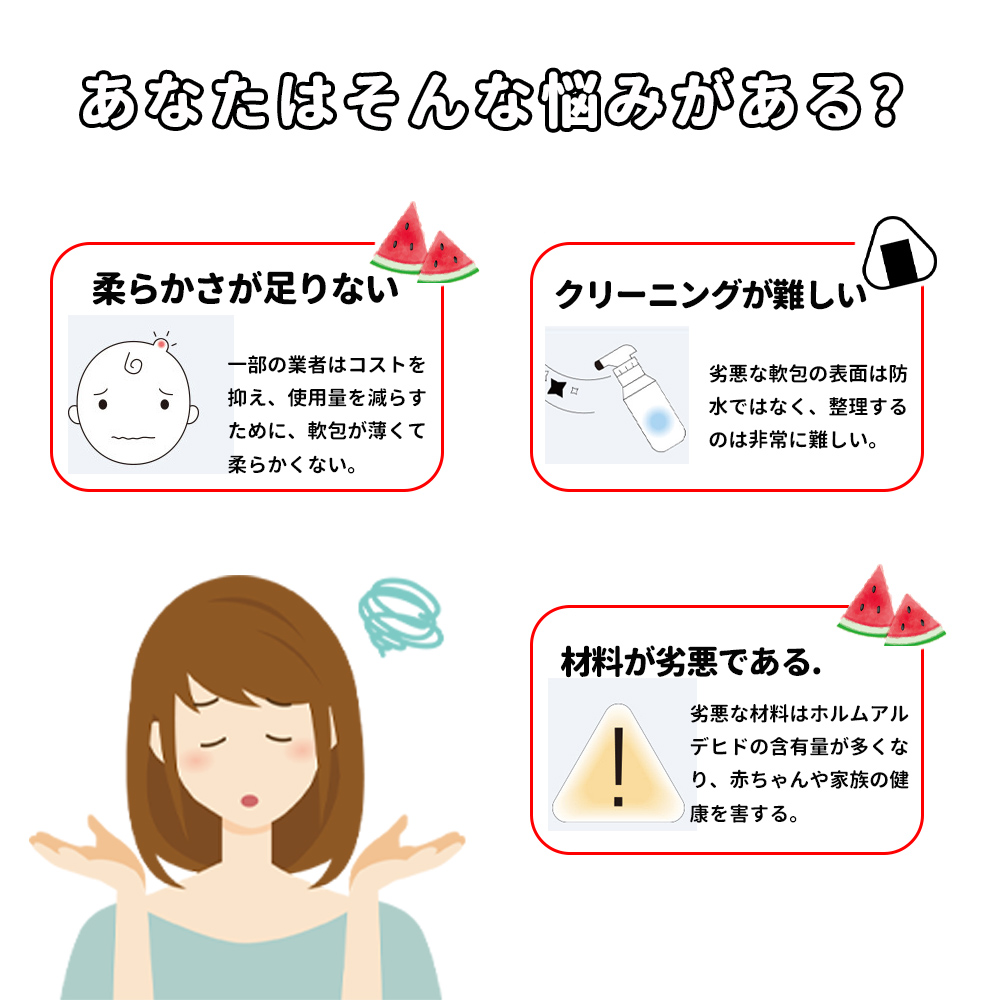 柔らかいPUに高密度ウレタンスポンジ内蔵で、弾力性のよいクッション性を持ち、ぶつかった時の衝撃を和らげ、吸収し、赤ちゃんや小さいお子様、ご年配の方がいらっしゃるご家庭や場所には最適です。