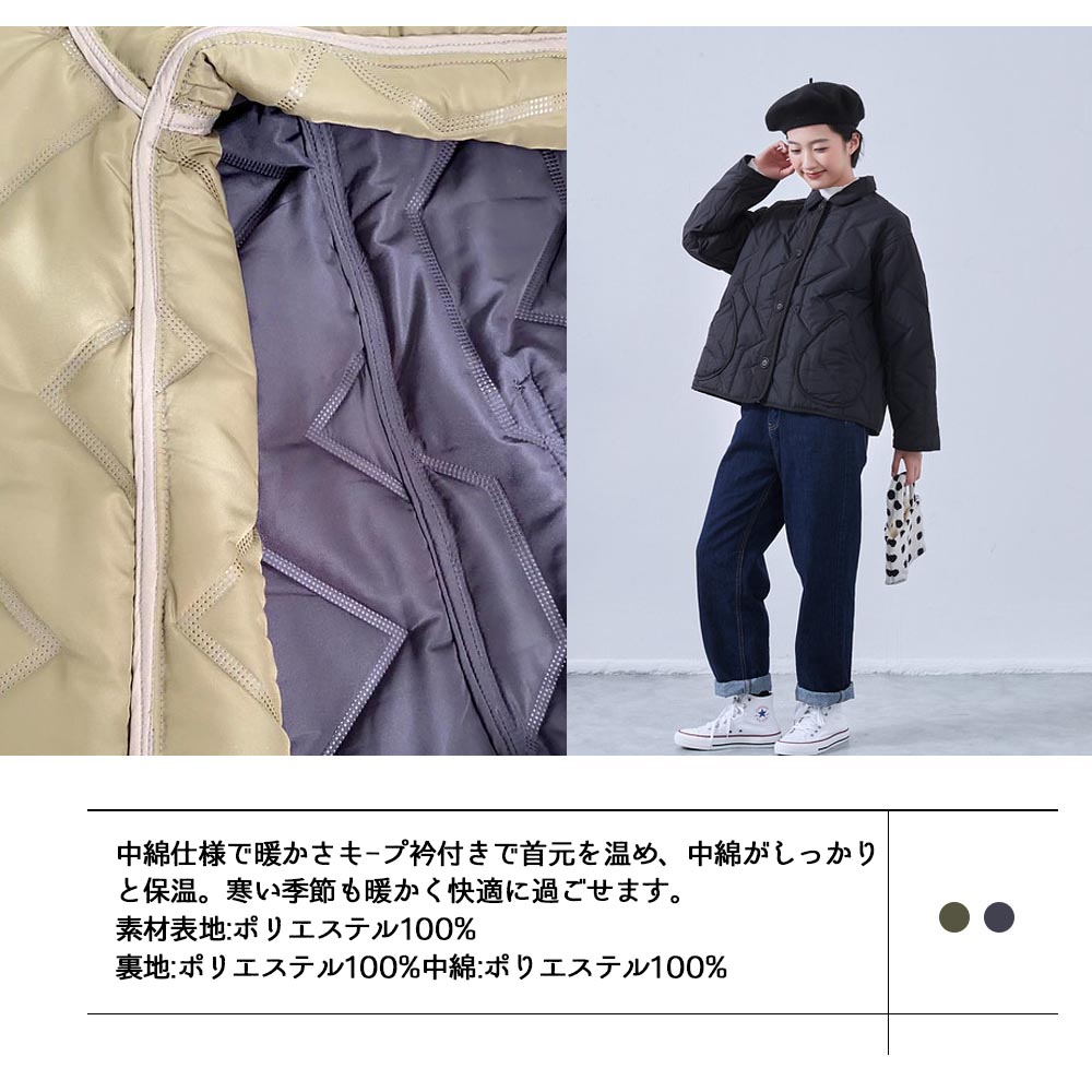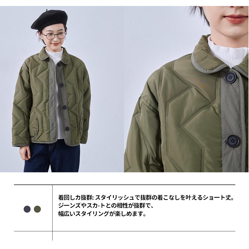 中綿仕様で暖かさキープ: 衿付きで首元を温め、中綿がしっかりと保温。寒い季節も暖かく快適に過ごせます。