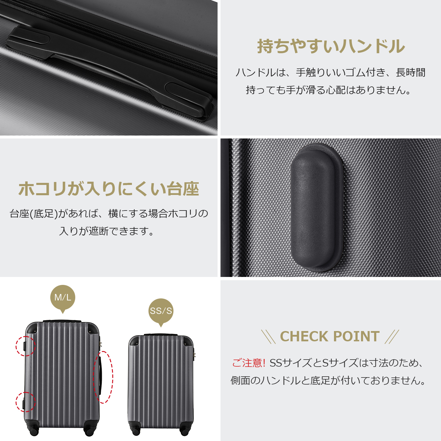 10.【ご注意】①内部ファスナーについて:ケース内部にあるファスナーはメンテナンス専用ファスナーとなります。修理が必要になった場合にのみ使用するファスナーのため、あえてファスナーのつまみが付いていません。お荷物を入れるものではありませんので、ご注意ください。②SSとSサイズは寸法のため、側面のハンドルと底足が付いておりません。予めご了承ください。③※掲数している写真は、ご使用のコンピューター及びスマホのモニターの種類によって、実際の商品のイメージと多少異なることがございます。予めこ了承ください。※ロットによって、製品の色は多少異なりますので、こ了承とこ理解の程よるしくお願いたします。