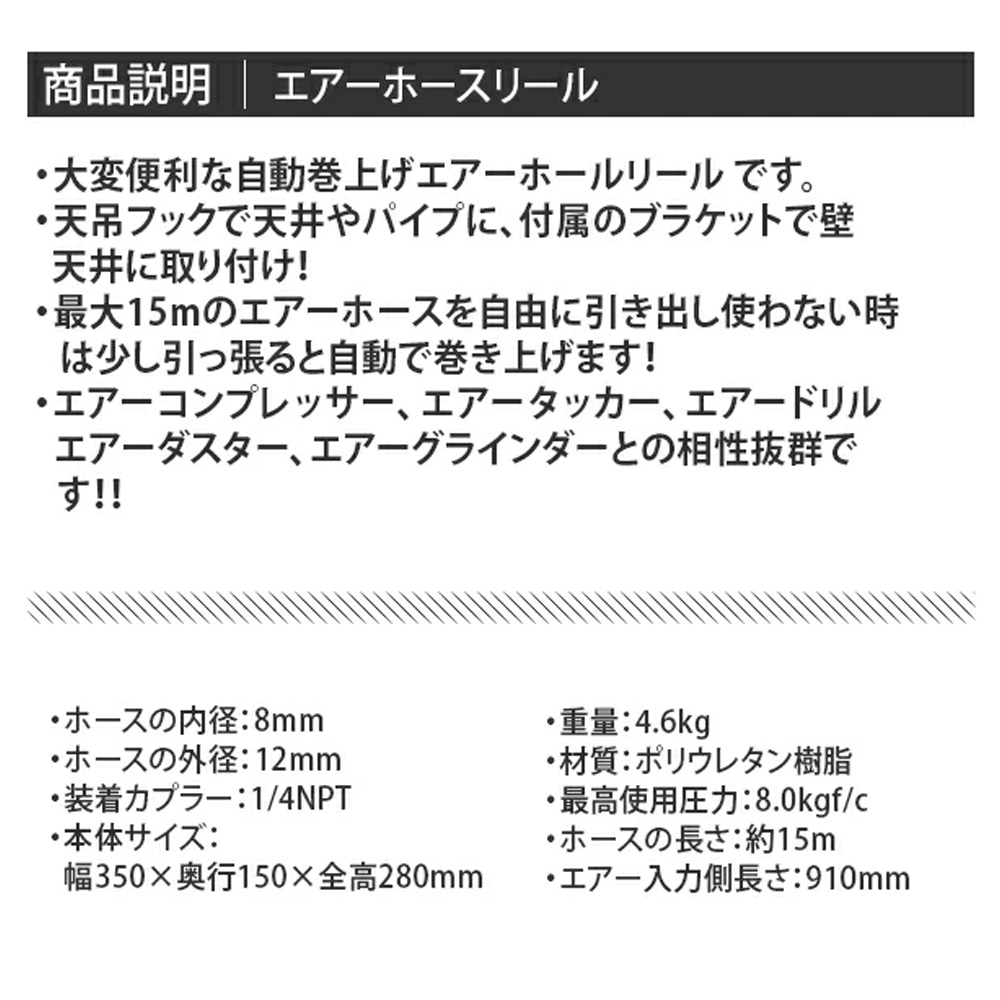 天吊フックで天井やパイプに、付属のブラケットで壁、天井に取り付け! 最大15mのエアーホースを自由に引き出し、使わないときは少し引っ張ると自動で巻き上げ!