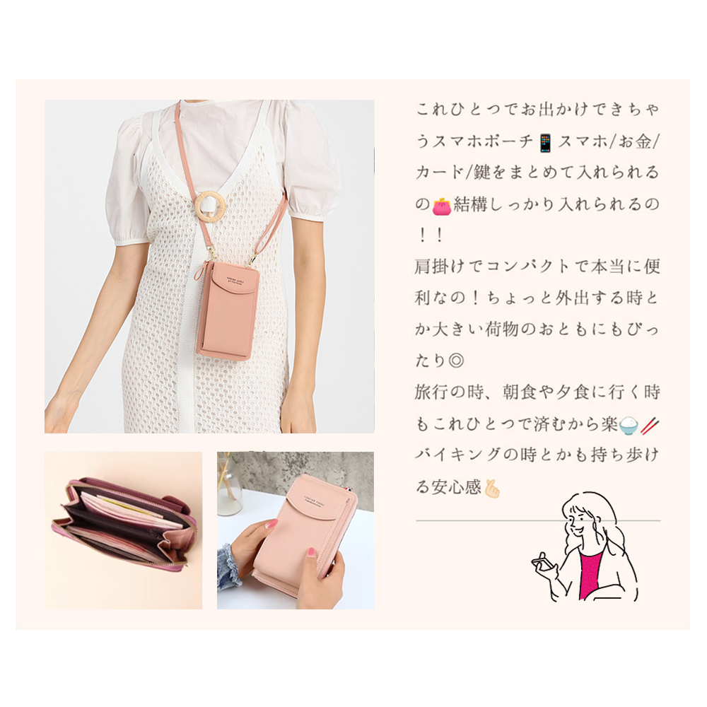 【ちょっとのお出かけに便利なスマホポーチ】スマホポーチ・スマホポシェットはちょっとしたお出かけに便利な機能性抜群のポーチです。スマホや小物の収納はもちろんお札や領収書、カードも入れられてお財布・カードケース代わりにもなり、これ一つで身軽にお出かけが出来ます。旅行用のサブバックとしてもおすすめ。