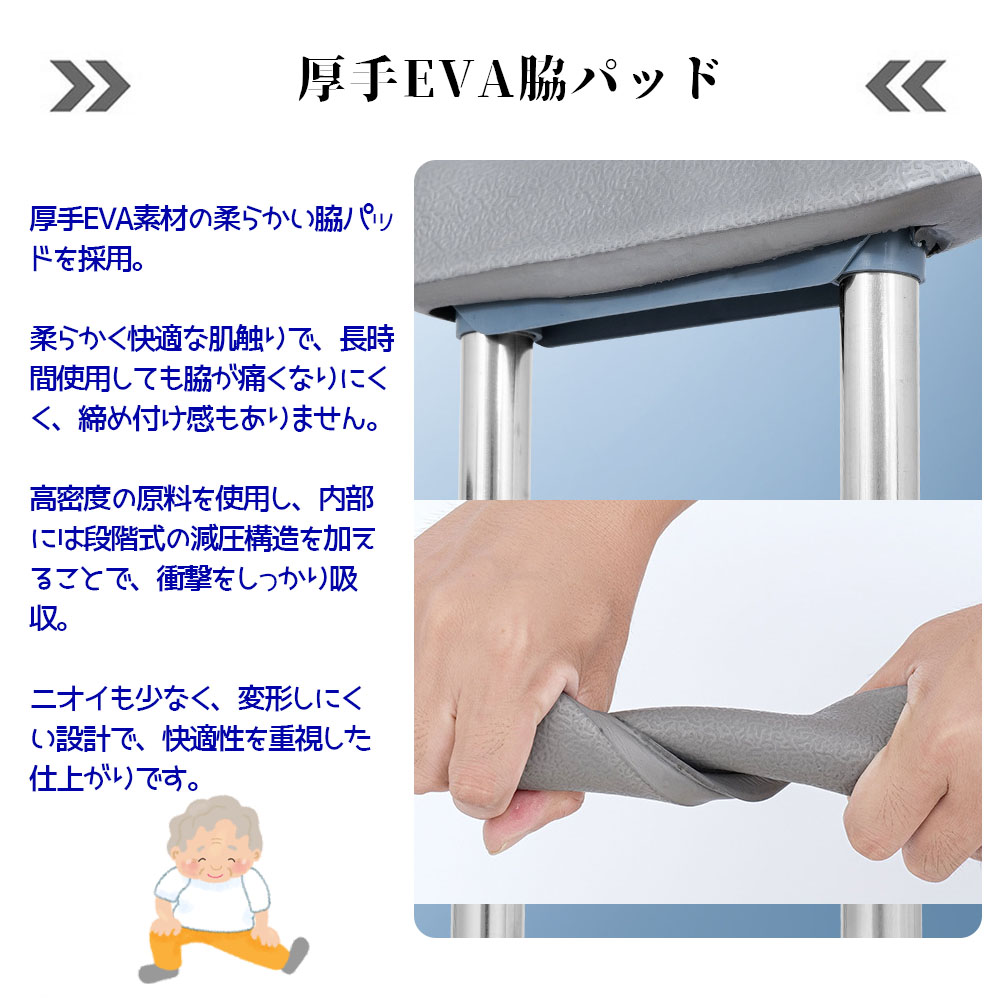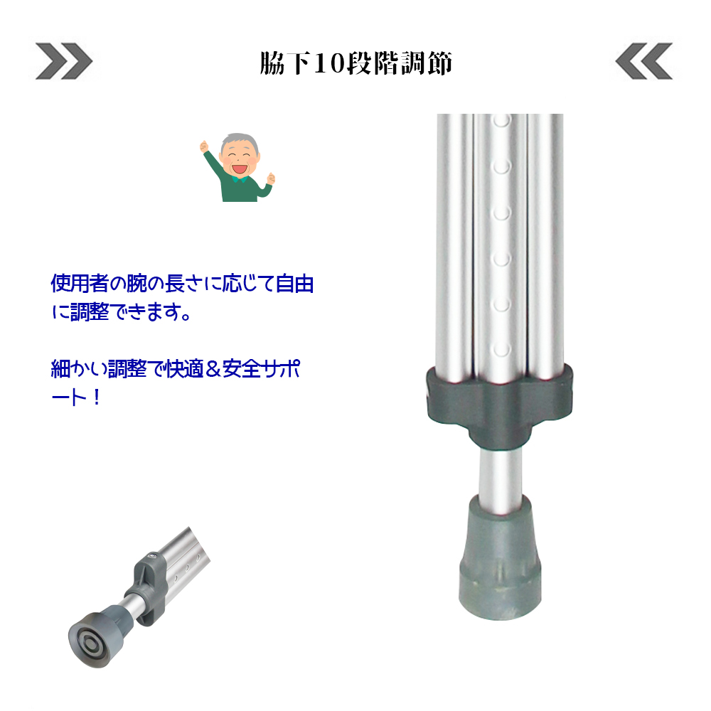 脇当て高さ10段階調節可能:使用者の腕の長さや身長に応じて調節でき、脇への負担を軽減します。