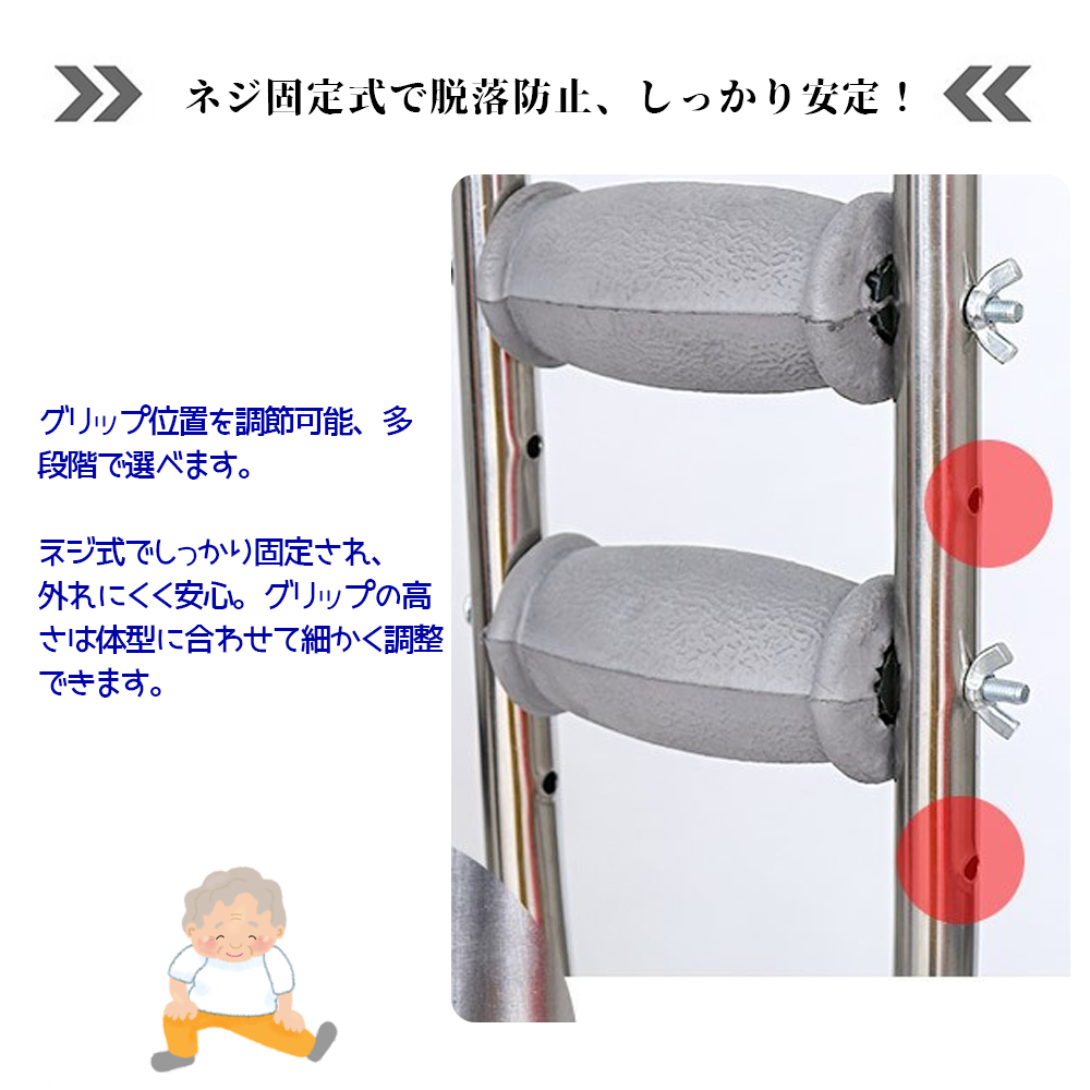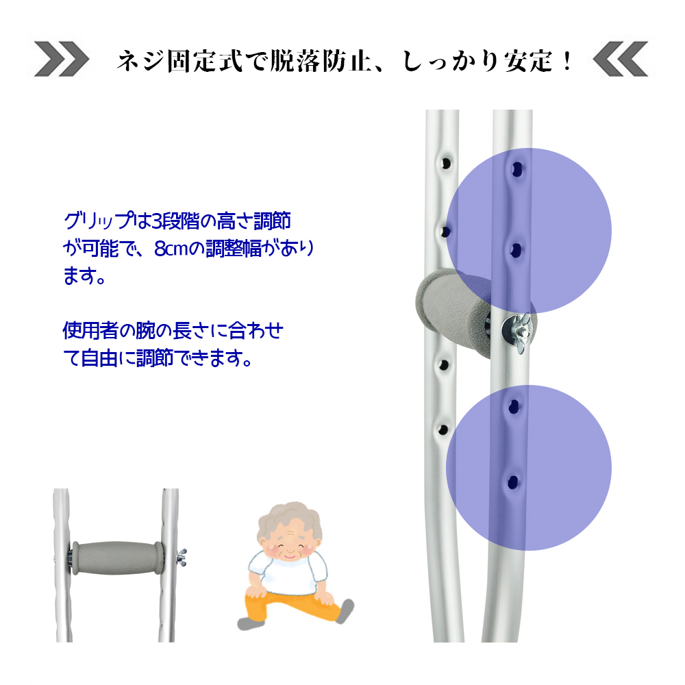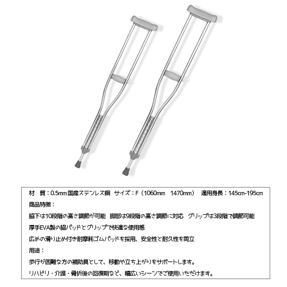 本製品は、多機能で調節可能な松葉杖で、歩行が困難な方の安定した移動をサポートするために設計されています。
