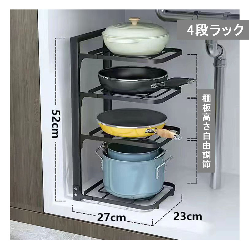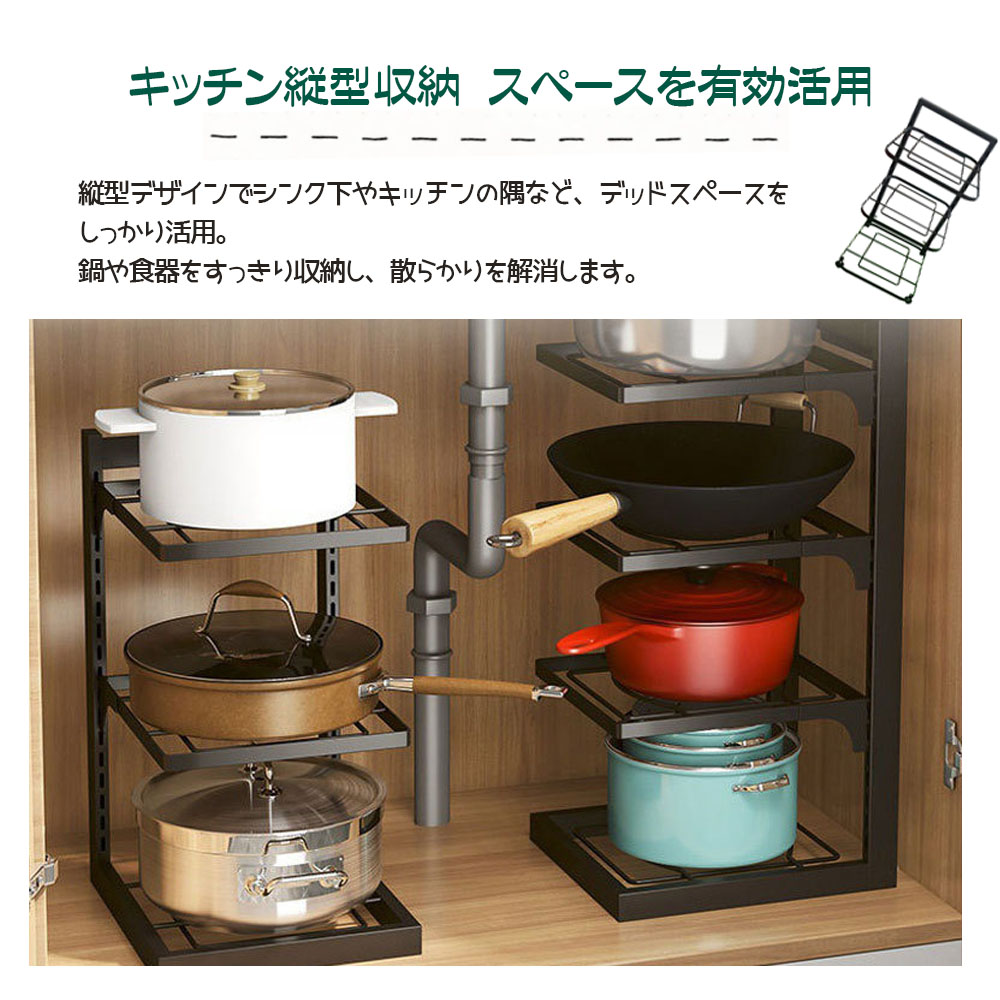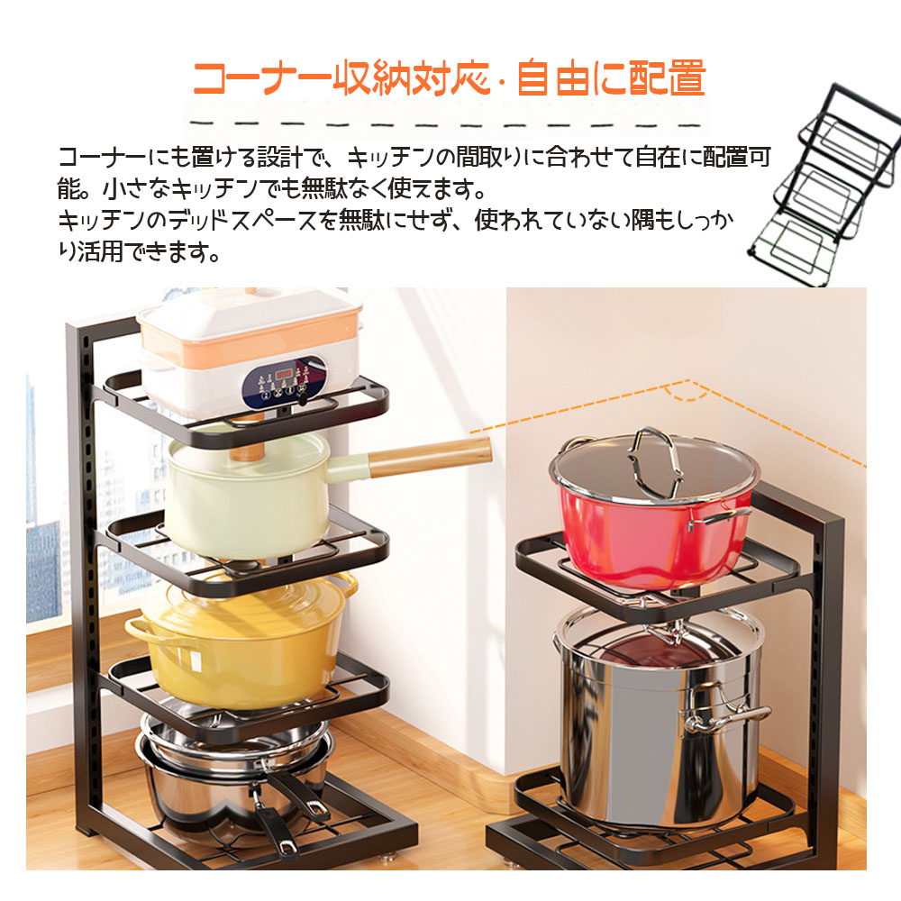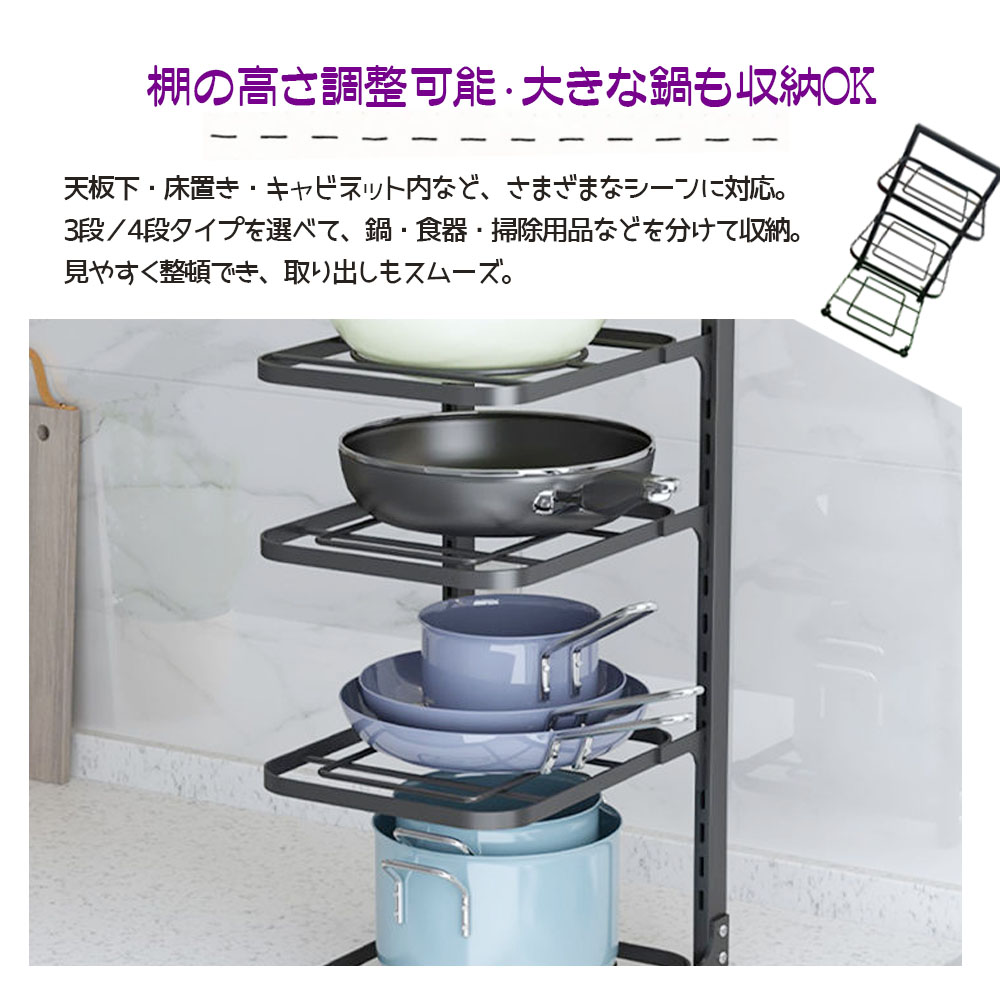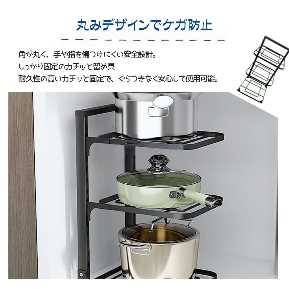 【多機能フライパンラック】:さまざまなサイズの鍋だけでなく、フライパン、ふた、オーブン皿、まな板、調理器具などの整理にも使用できます。