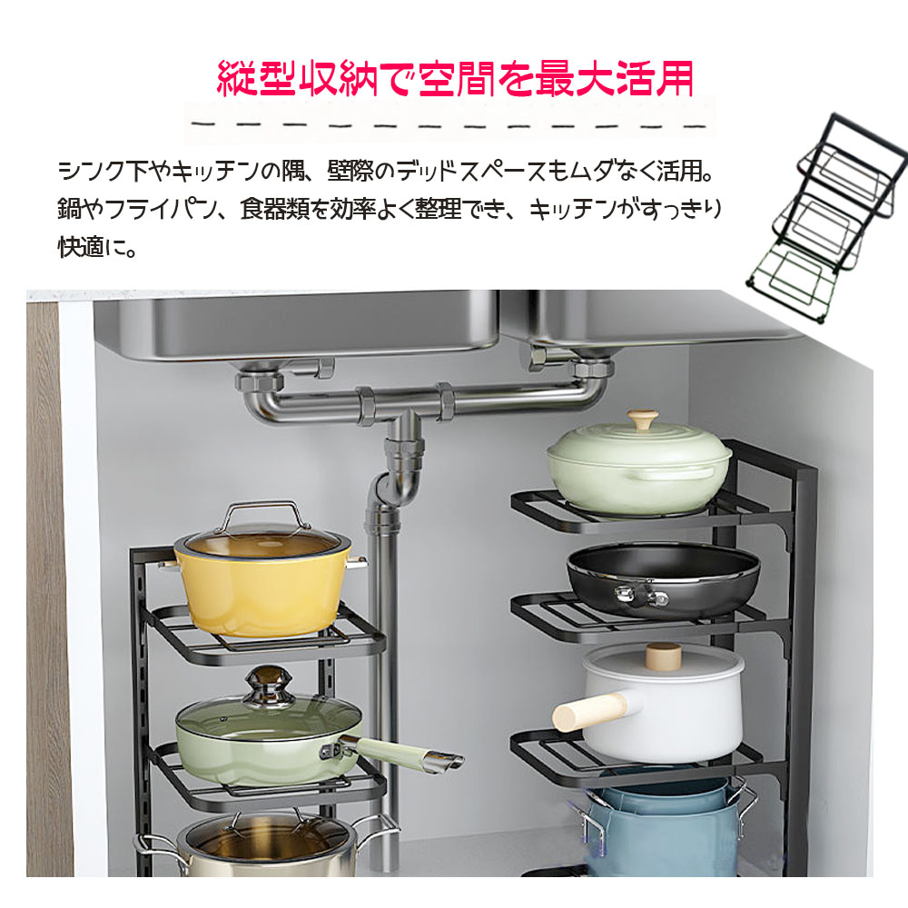 【キッチンすっきり】:フライパンラックは、テーブル上はもちろんシンク下にも整然と収納でき、多くの鍋をスッキリ片付けられ、取り出しもラクラク。キッチンがきれいに保てます。