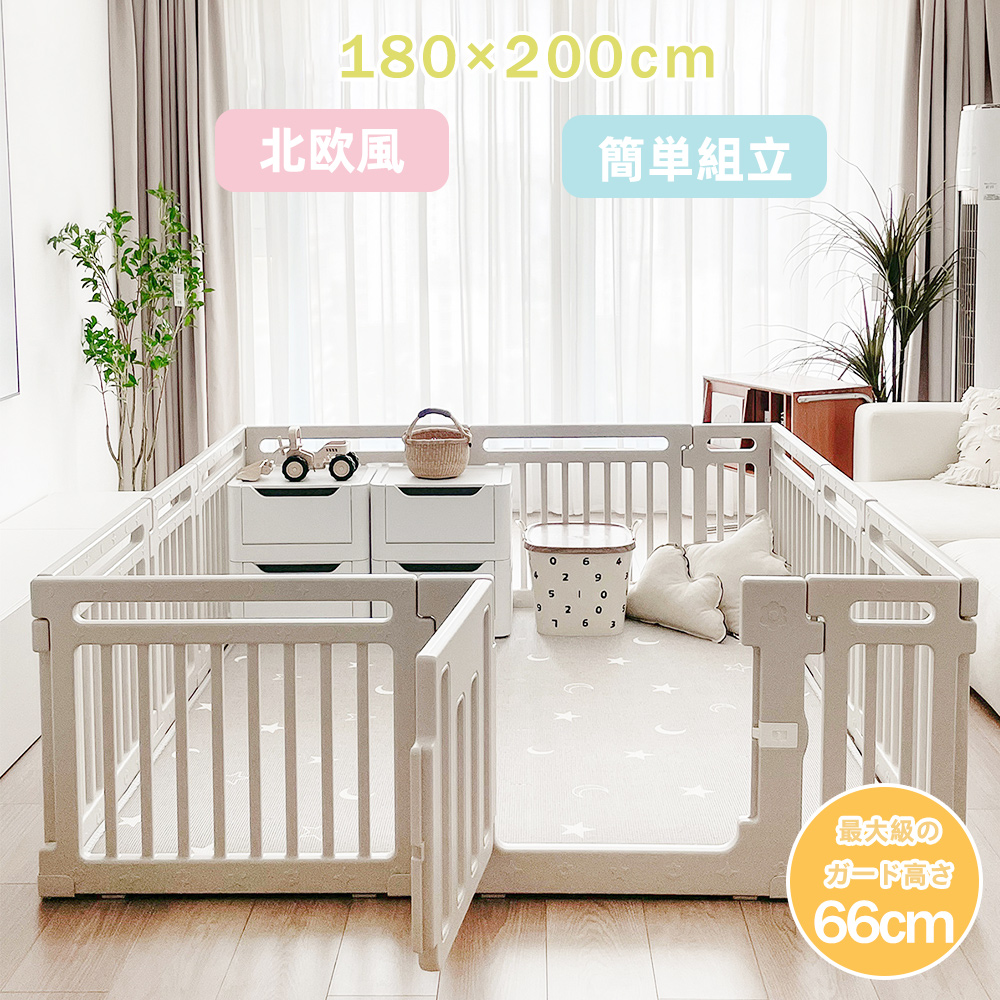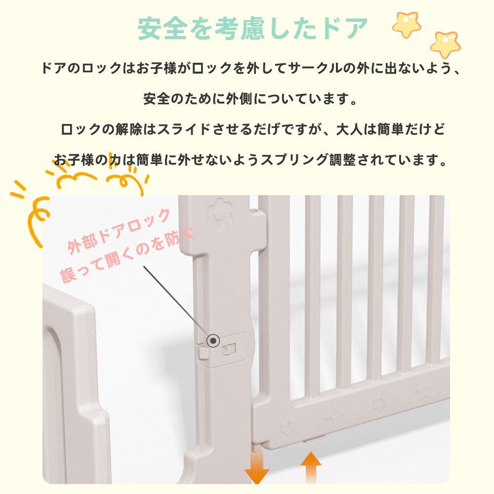 【科学的なデザイン】6ヶ月から3歳児の習慣に基づいてガードレールの高さを66 cmに設計し、赤ちゃんがフェンスの中で遊んでいるときに視界を遮らず、お母さんが家事中に赤ちゃんの動きを見やすいようにしました。また、66 CMの高さは赤ちゃんが歩くのを学ぶのにぴったりです。ドアロックは外からしか開かず、赤ちゃんが勝手にドアを開けて危険が発生するのを防ぐことができます。
