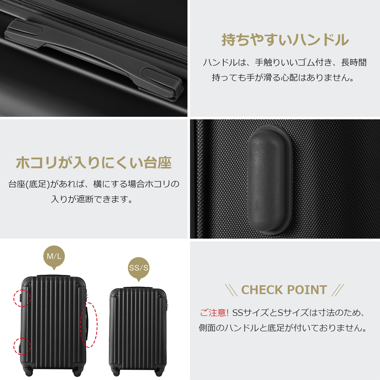 10.【ご注意】①内部ファスナーについて:ケース内部にあるファスナーはメンテナンス専用ファスナーとなります。修理が必要になった場合にのみ使用するファスナーのため、あえてファスナーのつまみが付いていません。お荷物を入れるものではありませんので、ご注意ください。②SSとSサイズは寸法のため、側面のハンドルと底足が付いておりません。予めご了承ください。③※掲数している写真は、ご使用のコンピューター及びスマホのモニターの種類によって、実際の商品のイメージと多少異なることがございます。予めこ了承ください。※ロットによって、製品の色は多少異なりますので、こ了承とこ理解の程よるしくお願いたします。