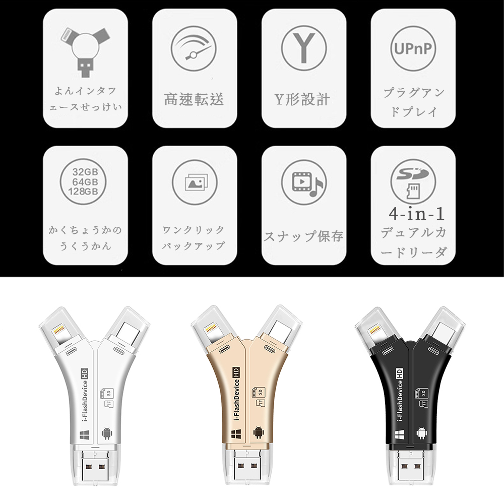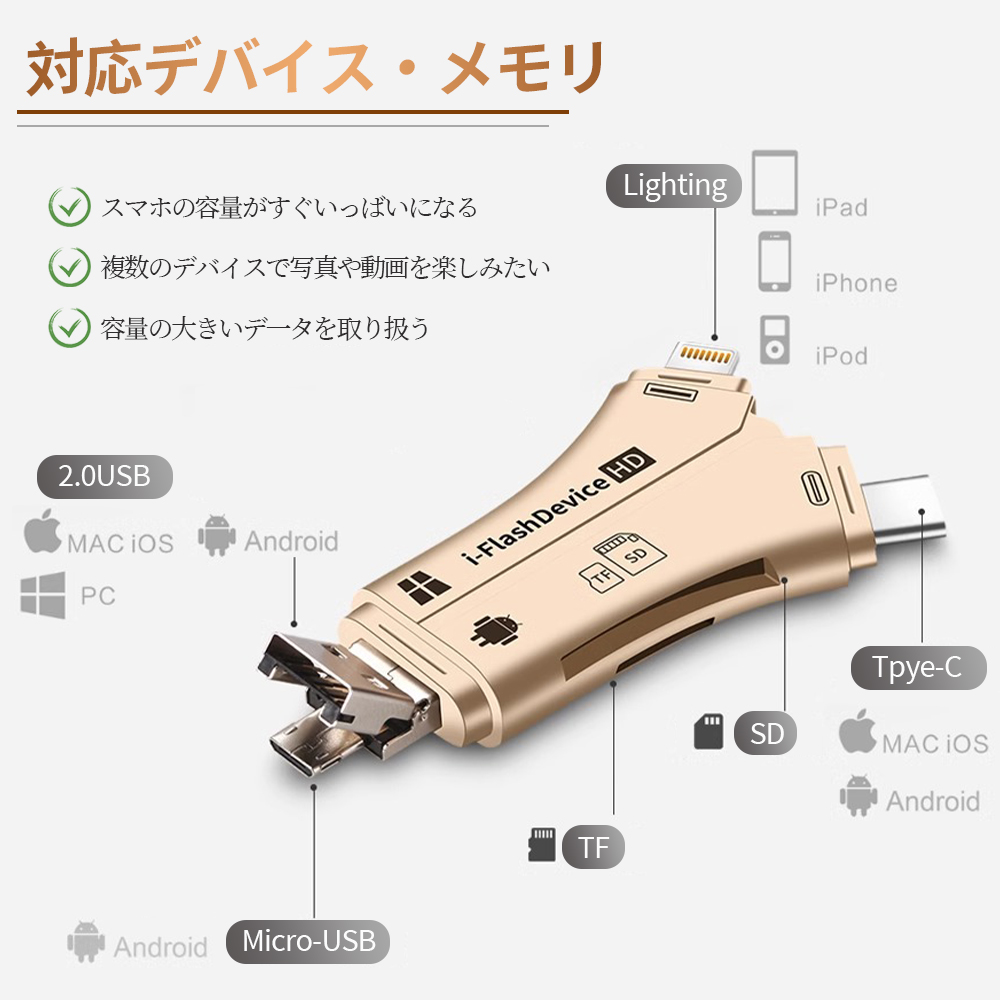SDカードリーダー iPhone バックアップ アダプター 読み取り USBメモリ 写真 保存 スマホ データ 高速移行 スマホ ノートパソコン カメラ カメラリーダー 音楽 4in1 容量不足解決 A-01