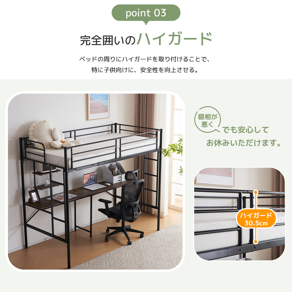 【完全囲いのハイガード】ベッドの周りにハイガードを取り付けることで、特に子供向けに、安全性を向上させる。 寝相が悪くでも安心してお休みいただけます。 ハイガードの高さ:30.5㎝