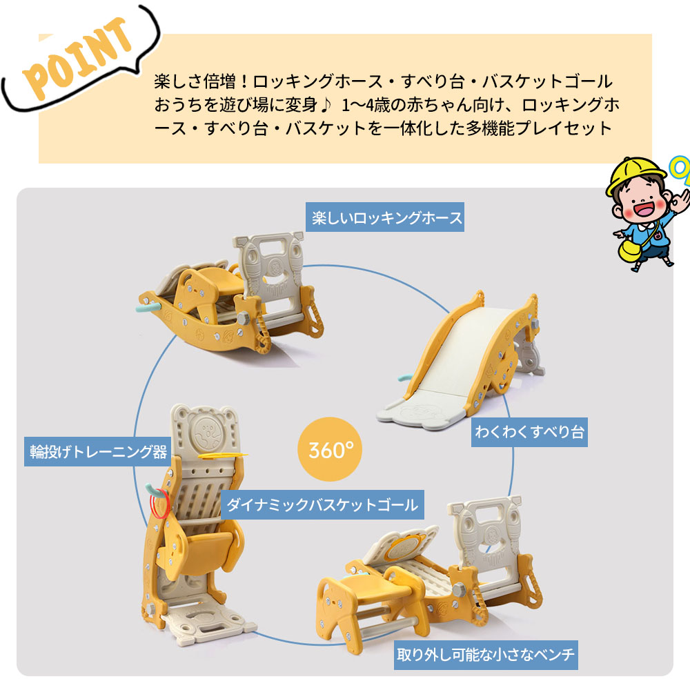 お子様の成長をサポートする、多機能な室内・屋外兼用の遊具です。すべり台、ロッキングホース、木馬、バスケットゴールの4つの遊び方がこれ1台で楽しめます。