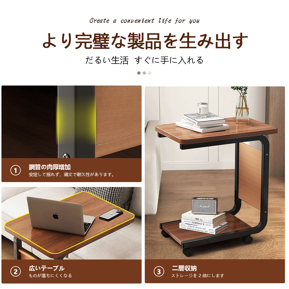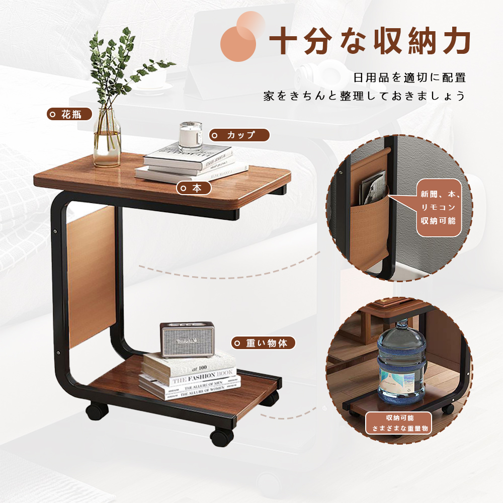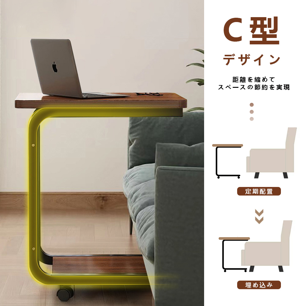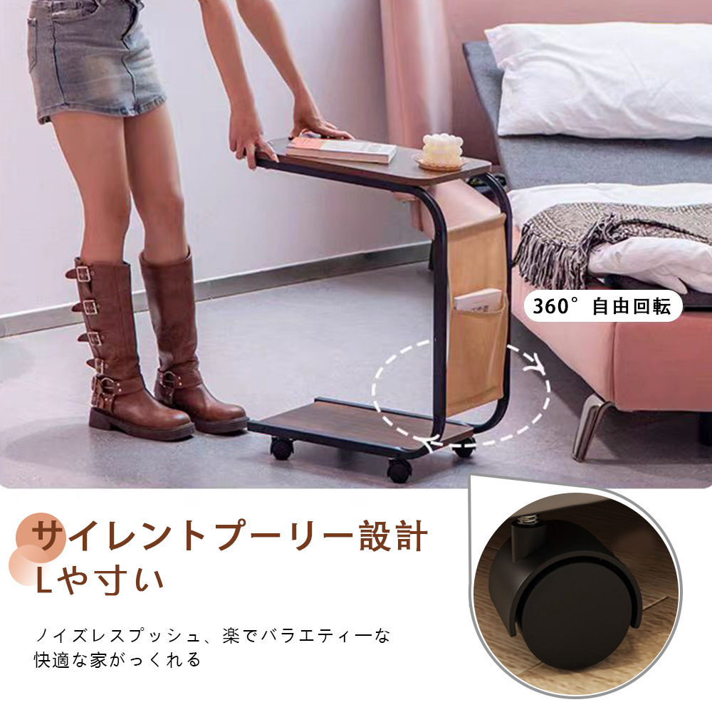 【コ字型テーブル】サイドテーブル キャスター付きはコ字型、ソファやベッドの下のスペースに入れ、隙間に差し込んでも使えます。ソファのサイドテーブルやリビングのサイドテーブルとしても使えます。