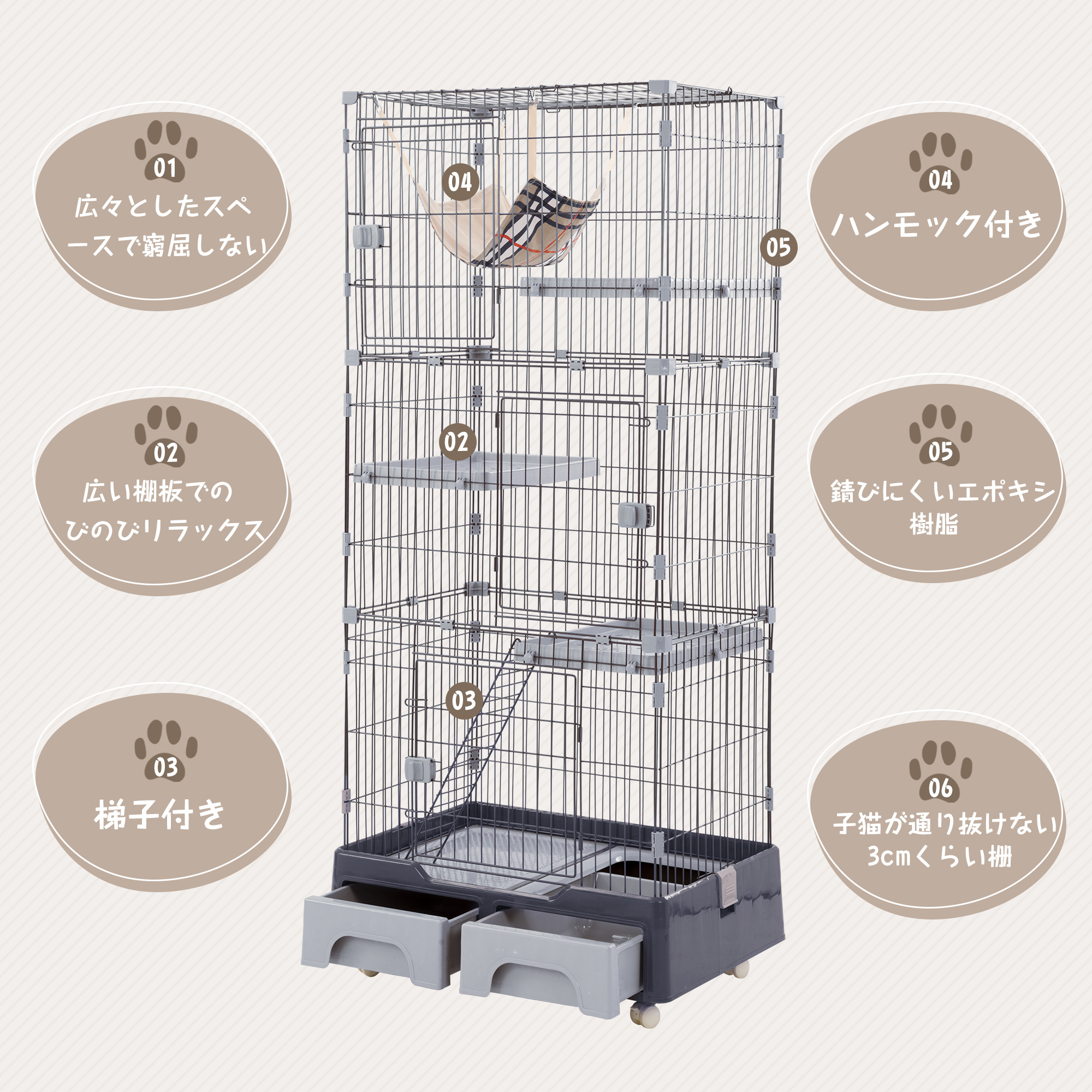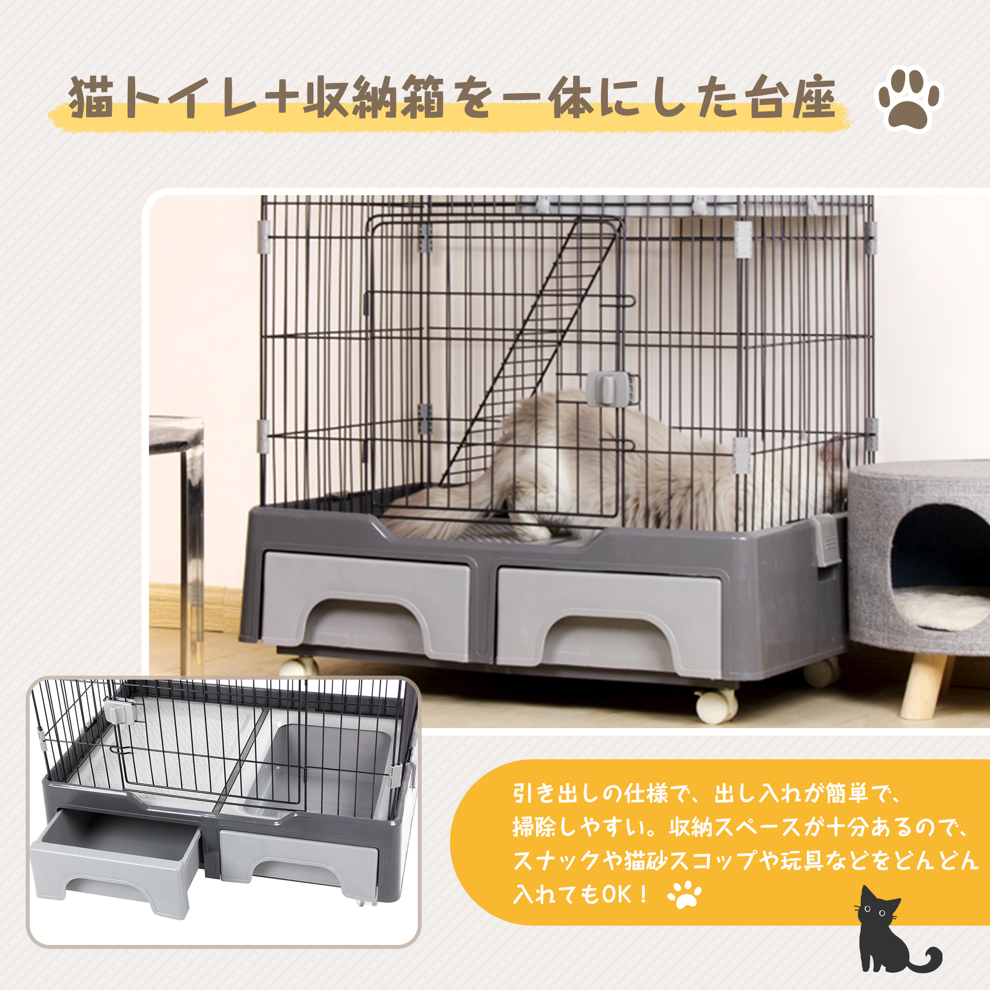 猫 ケージ トイレ付 ハンモック付 収納型 キャットケージ 3段 1段2段可能 キャスター付 キャットハウス ネコ【グレー】TX294682AAA