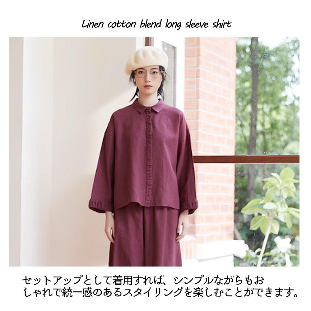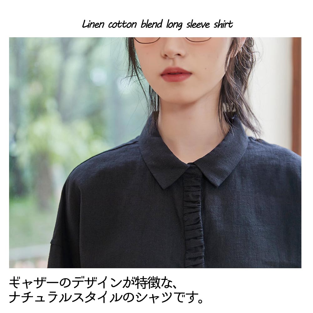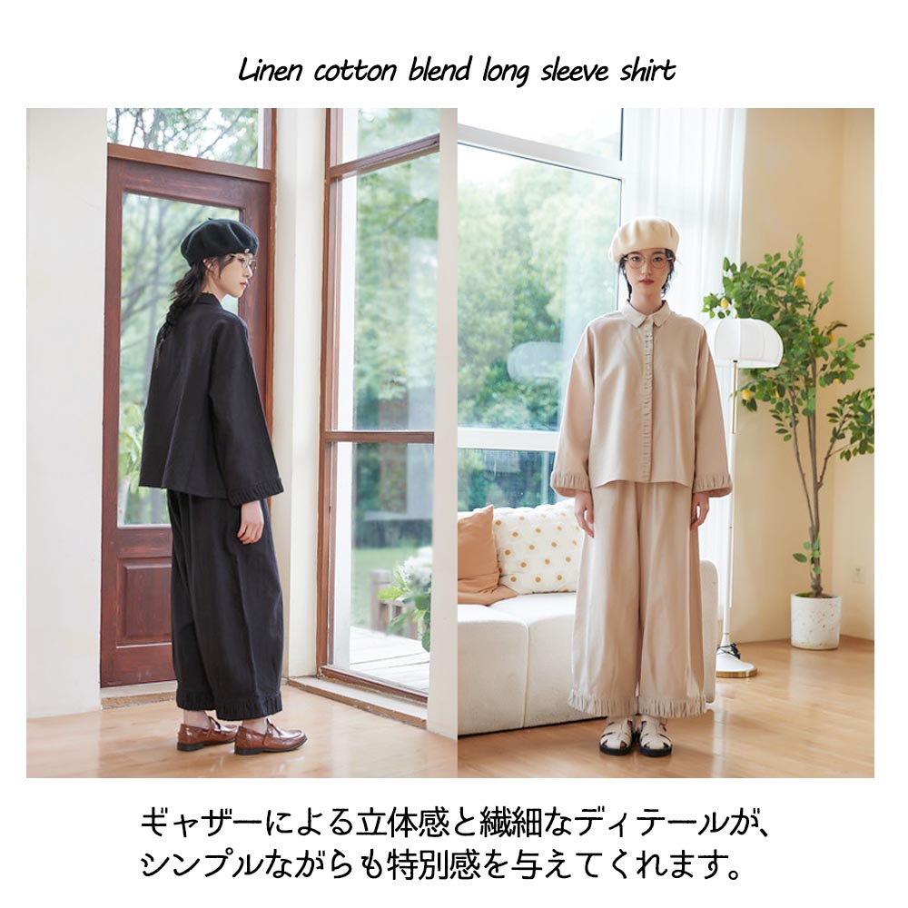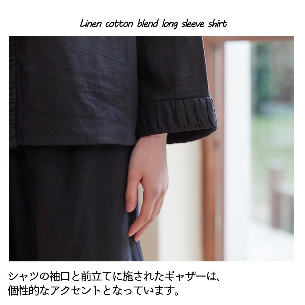 ギャザーのデザインが特徴な、ナチュラルスタイルのシャツです。シャツの袖口と前立てに施されたギャザーは、個性的なアクセントとなっています。ギャザーによる立体感と繊細なディテールが、シンプルながらも特別感を与えてくれます。リネンコットンミックス素材を使用しており、柔らかさと通気性、吸湿性や速乾性にも優れており、暑い季節でも快適に着用できます。