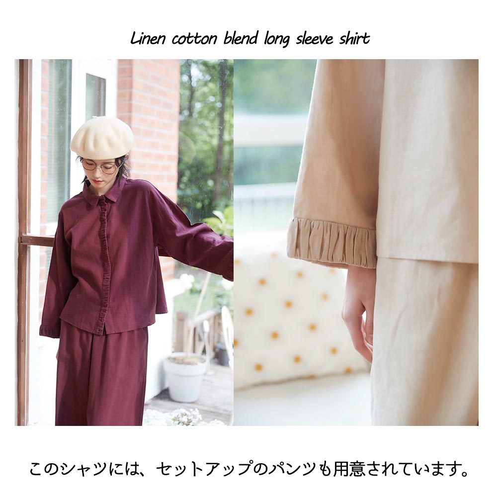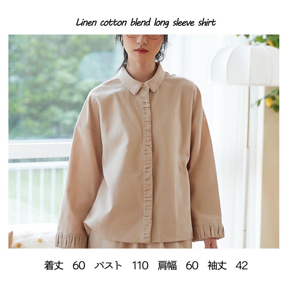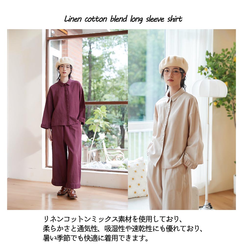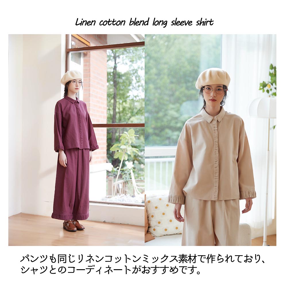 ギャザーのデザインが特徴な、ナチュラルスタイルのシャツです。シャツの袖口と前立てに施されたギャザーは、個性的なアクセントとなっています。ギャザーによる立体感と繊細なディテールが、シンプルながらも特別感を与えてくれます。リネンコットンミックス素材を使用しており、柔らかさと通気性、吸湿性や速乾性にも優れており、暑い季節でも快適に着用できます。