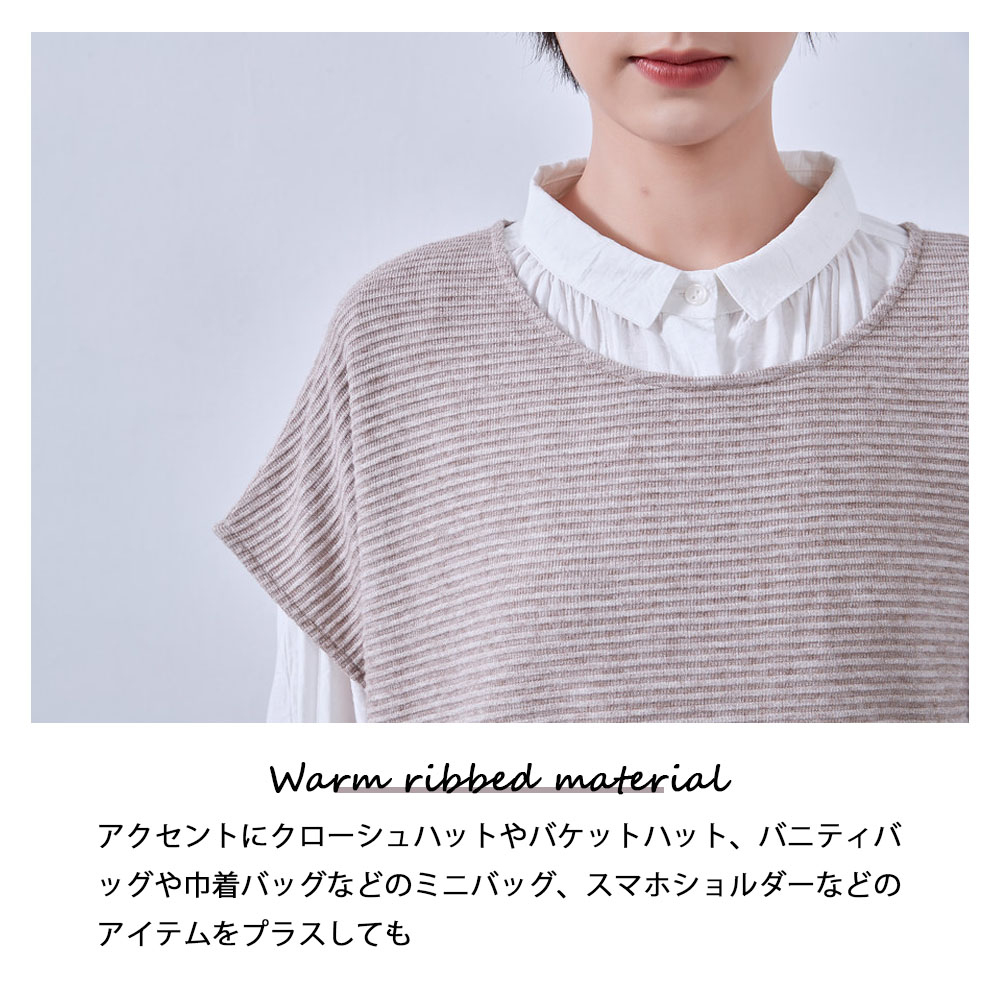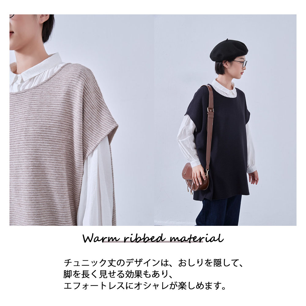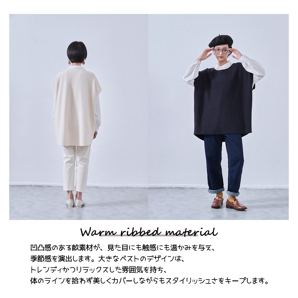 凹凸感のある畝素材が、見た目にも触感にも温かみを与え、季節感を演出します。大きなベストのデザインは、トレンディかつリラックスした雰囲気を持ち、体のラインを拾わず美しくカバーしながらもスタイリッシュさをキープします。チュニック丈のデザインは、おしりを隠して、脚を長く見せる効果もあり、エフォートレスにオシャレが楽しめます。