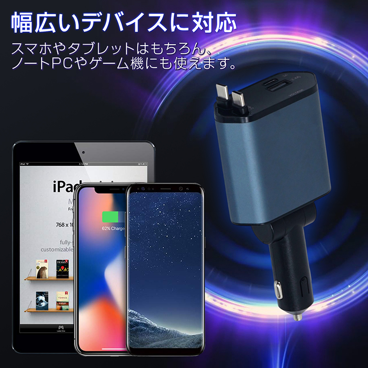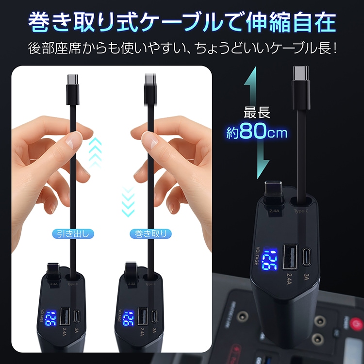 ■最長80cmの巻き取り式ケーブルで、後部座席でもらくらく使える!