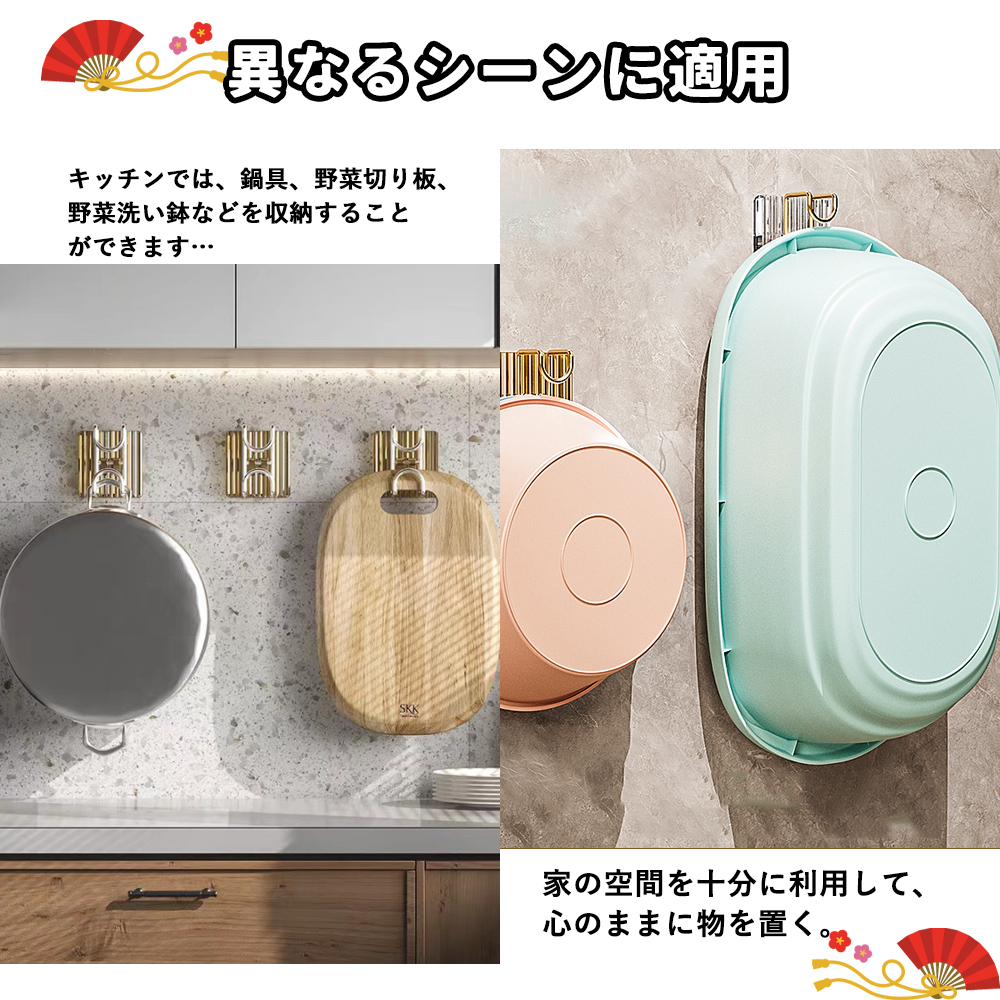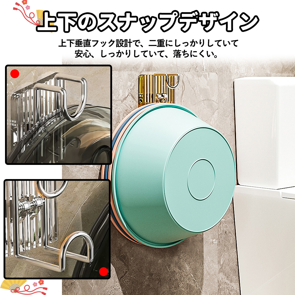 【高い実用性】革新的なデザインなので大きな洗面器をしっかりキャッチし、同時に複数の洗面器をかけることもできます。信頼できる耐荷重と安定性があり、吸盤と違って時間の経過で落ちてくることもありません。