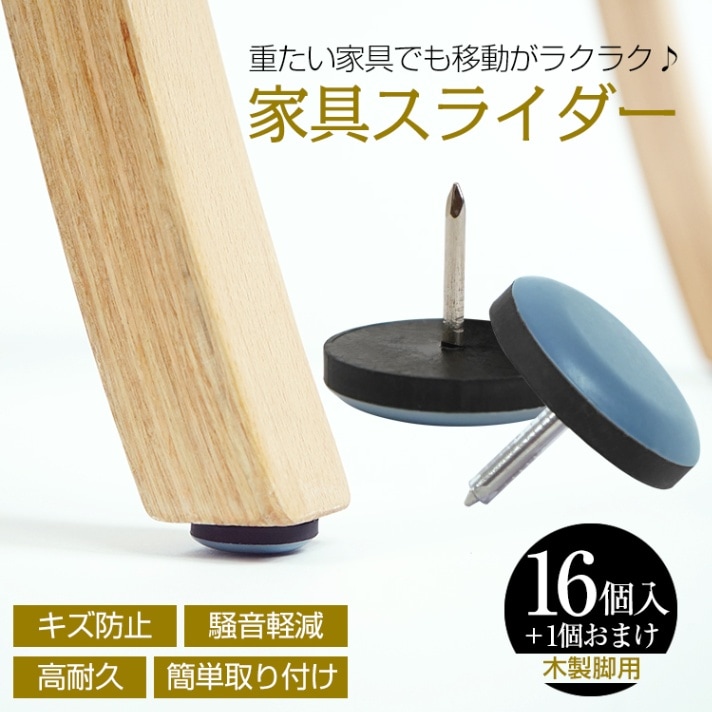 家具スライダー16個+1個おまけ 脚キャップ 丸形 釘タイプ 家具移動 キズ防止 木製脚用 高耐久 騒音軽減 簡单取り付け 床保護 in001