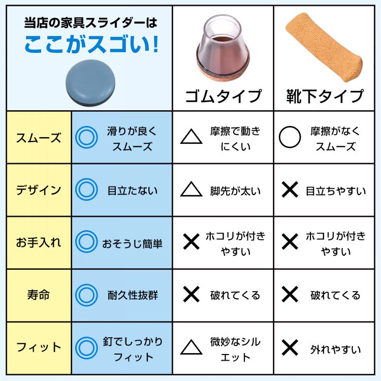 ■床との摩擦を減らし、キズや騒音を防いでくれる家具スライダーです。