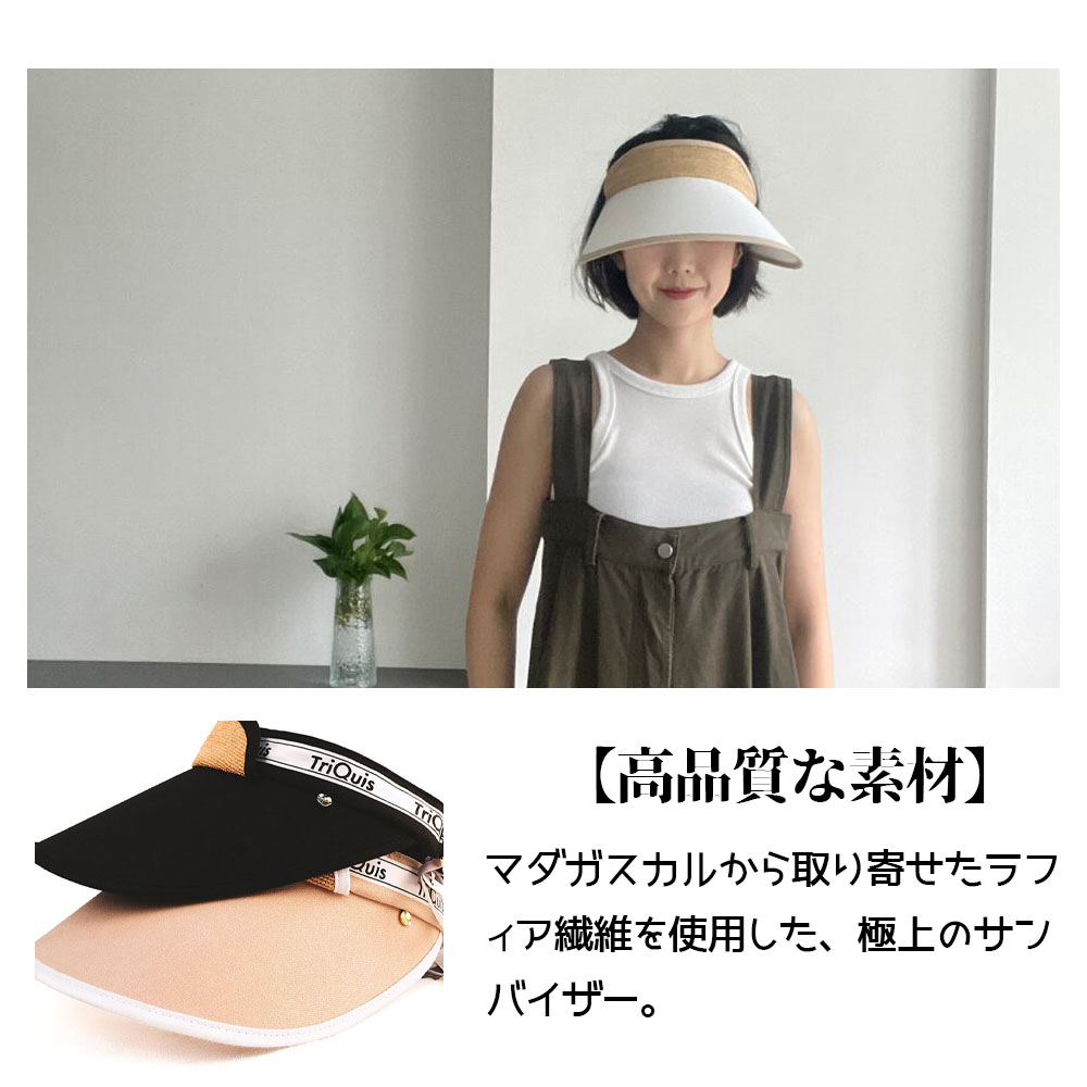 【高品質な素材】マダガスカルから取り寄せたラフィア繊維を使用した、極上のサンバイザー。軽量で快適な被り心地が特徴で、長時間の使用でも疲れにくいです。