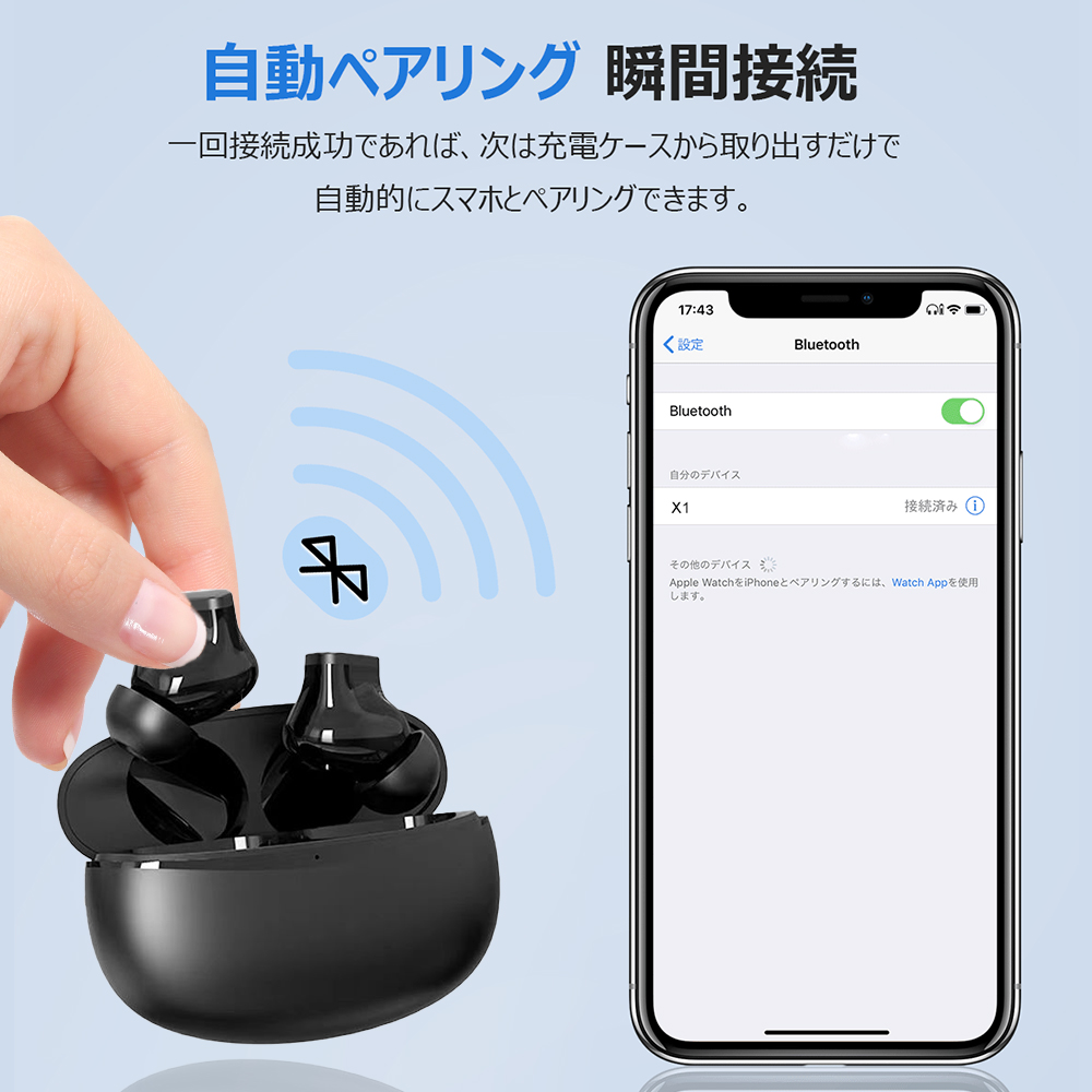 最新のペアリング技術により、初回ペアリング後は充電ケースからイヤホンを取り出すだけで自動的に接続します。左右のイヤホンの片耳使用と両耳使用を簡単に切り替えられる他、防水性能も備えています。ジョギングやスポーツ中の雨や汗にも安心です。