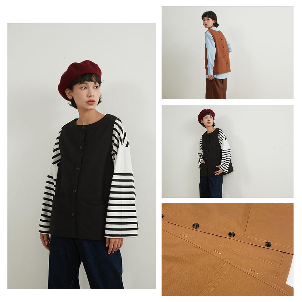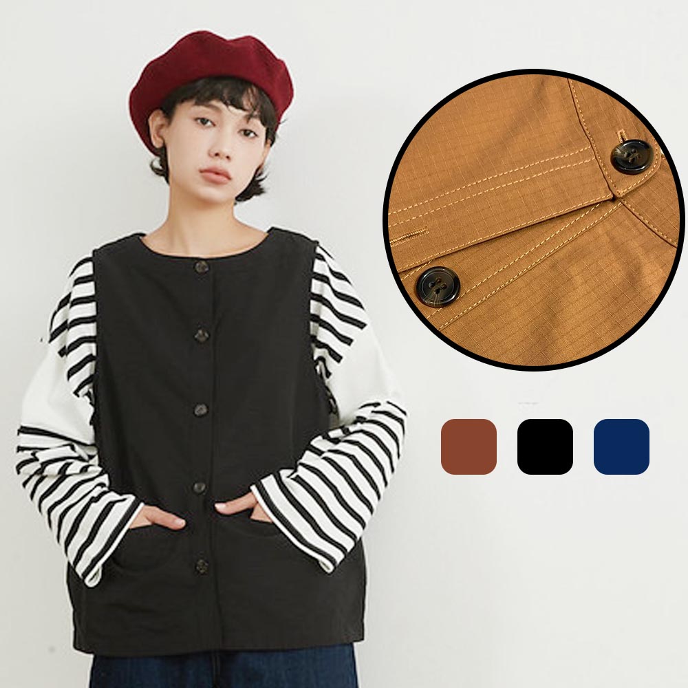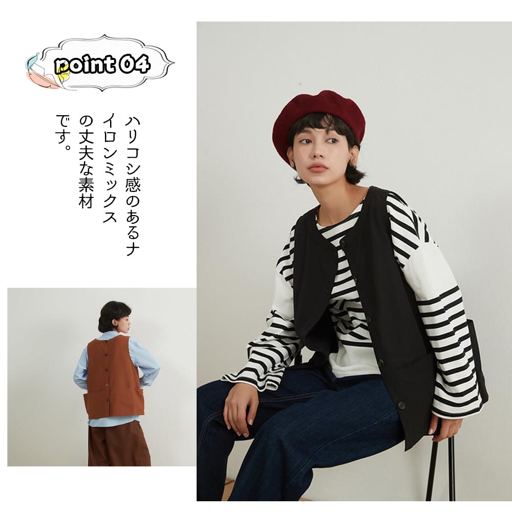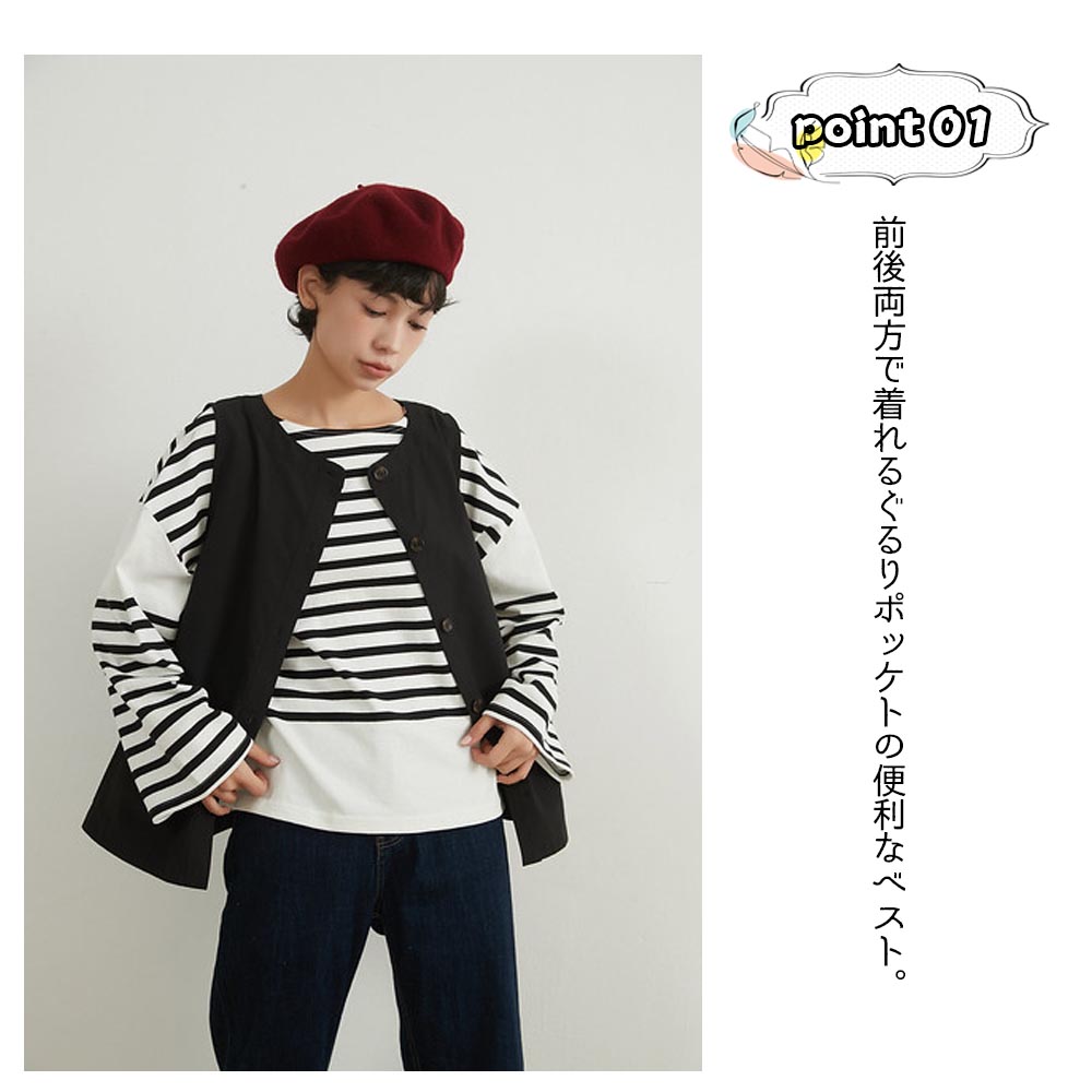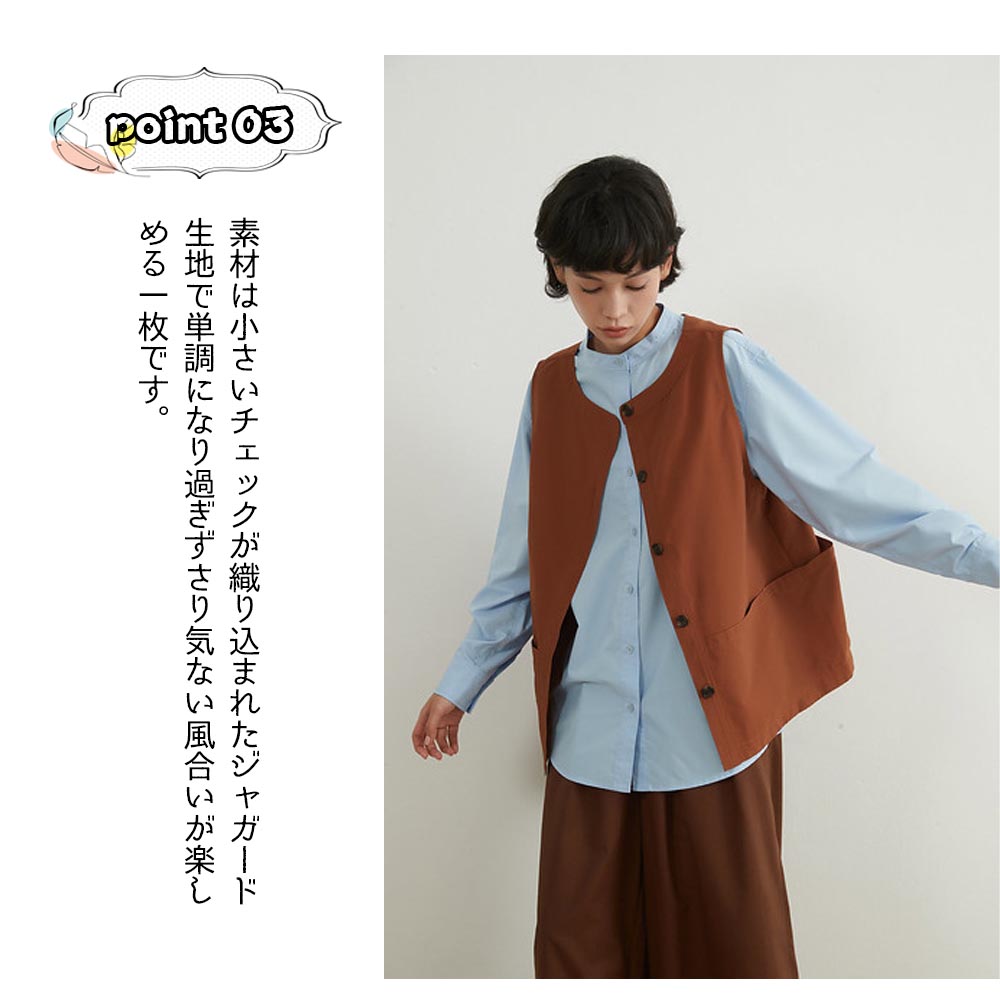 前後両方で着れるぐるりポッケトの便利なベスト。春から秋にかけて長く使えてレイヤードにぴったりのアイテムです。素材は小さいチェックが織り込まれたジャガード生地で単調になり過ぎずさり気ない風合いが楽しめる一枚です。ハリコシ感のあるナイロンミックスの丈夫な素材です。