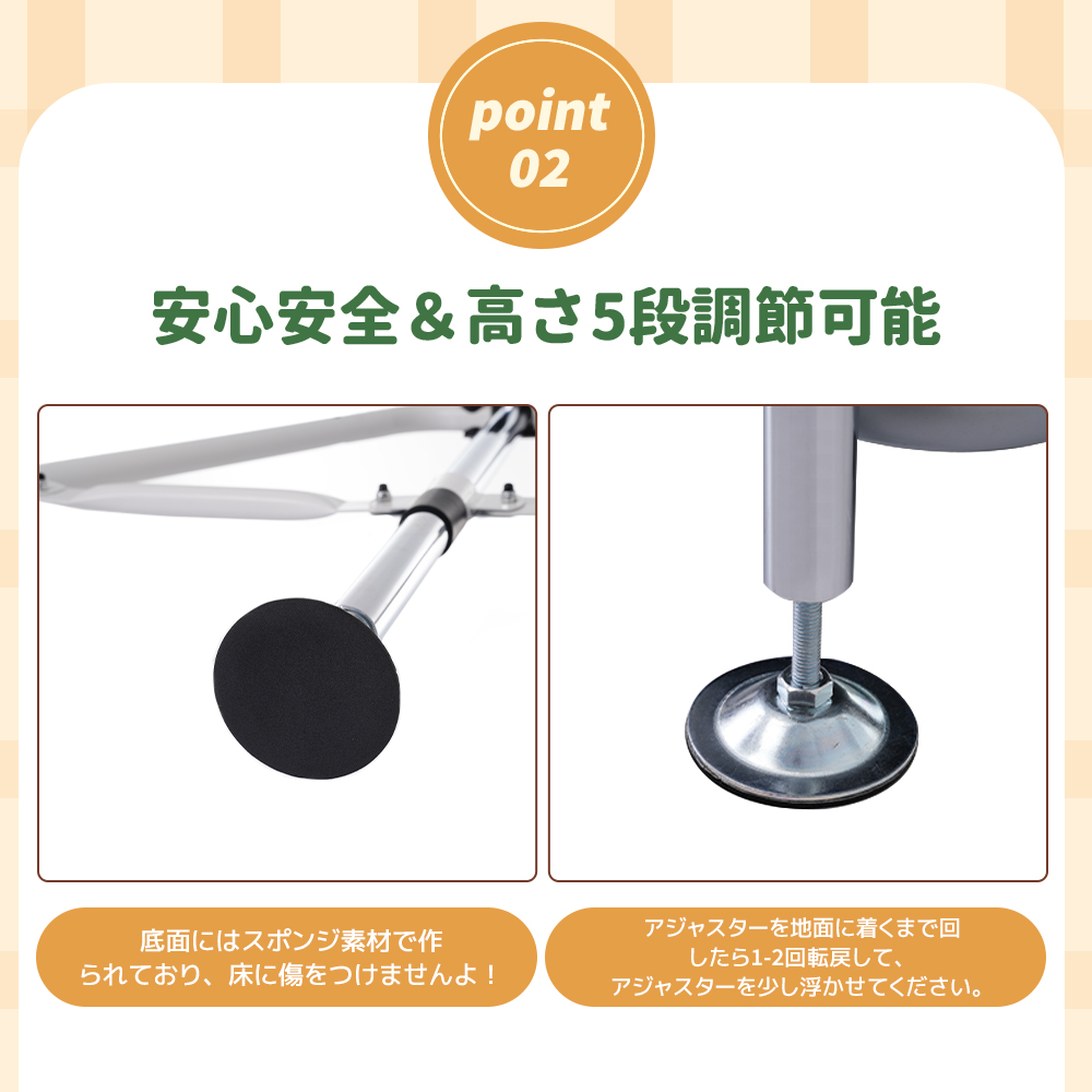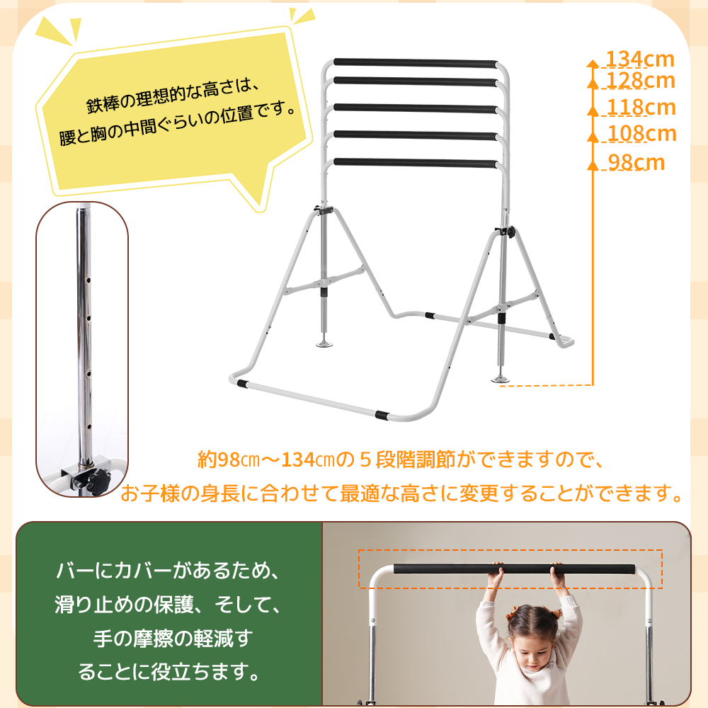 【高さ5段調節可能】2重ロック固定:鉄棒の穴にはネジとピンによる2重ロック構造でしっかり固定! これにより、お子様が使用している際でも安心感があり、高い安全性が確保されています。 ネジを抜かずに、わずかに緩めて引っ張ると簡単に高さを調整できます。 *高さ調整後は、ネジをしっかりと締め、固定してください。約98㎝~134㎝の5段階調節ができますので、お子様の身長に合わせて最適な高さに変更することができます。