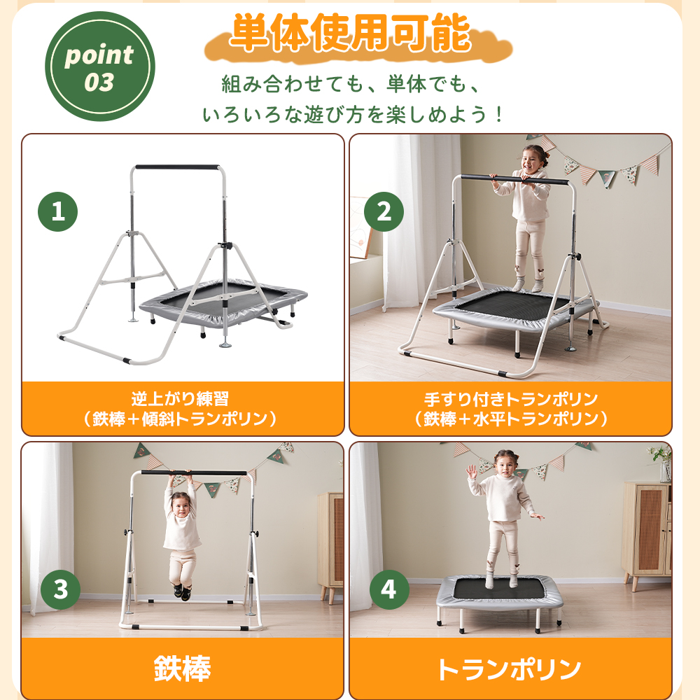 【単体使用可能】組み合わせても、単体でも、いろいろな遊び方を楽しめよう!1逆上がり練習 (鉄棒+傾斜トランポリン) 2手すり付きトランポリン (鉄棒+水平トランポリン) 3鉄棒 4トランポリン