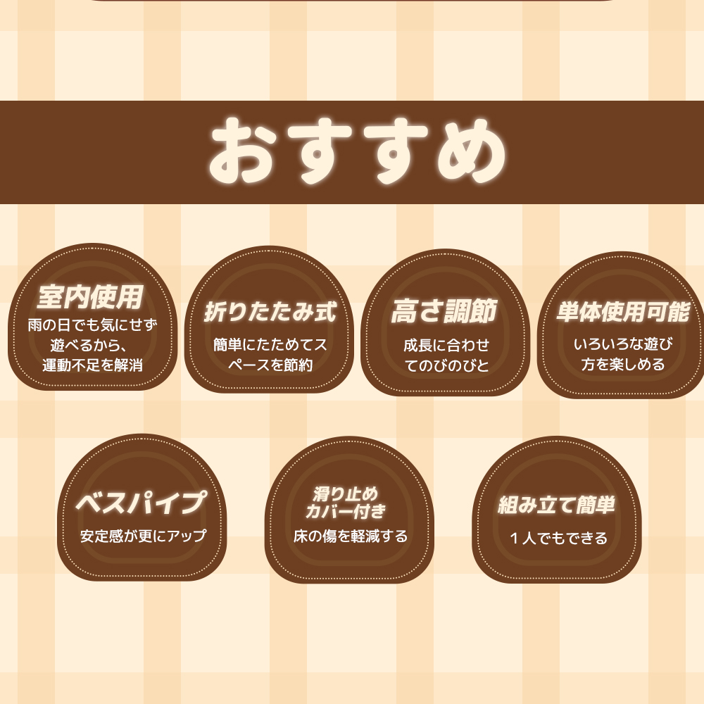 【ベースパイプ&滑り止めカバー付き】ベースパイプの形はU字で、ゴムのカバー付きなので、 安定感はもちろん、お子様はけがをしないようになっています。 床の傷やズレも軽減します。