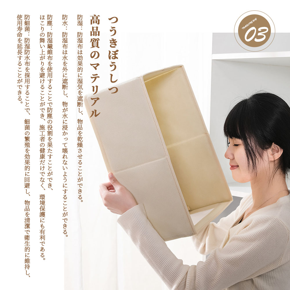| 注意事項 | ※商品の色はモニターの具合で実物と若干異なる場合がございます。予めご了承下さい。 ※本品は除湿、防虫、防カビなどの効果はありませんので、ご使用の際は市販品の除湿剤、防虫剤、防カビ剤を入れて使用してください。 ※本製品の芯材は厚紙です。水洗いはできませんのでご注意ください。 ※生地にハリを持たせるため、でんぷんをベースとしたコーティングを施しています。使い始めはコーティングのニオイがしますが、日が経つにつれニオイは薄まります。安心してご利用ください。 |