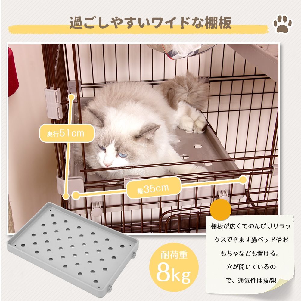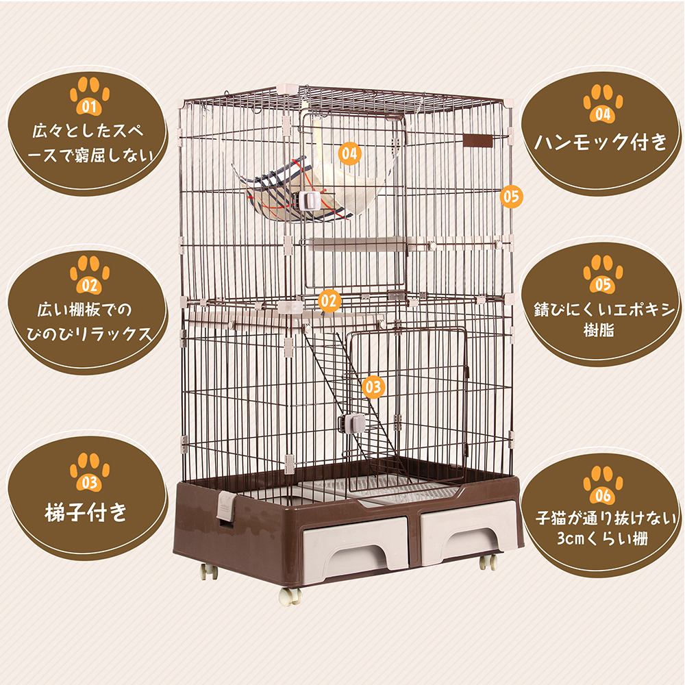 【商品情報】 n 素材: 線材:鉄(粉体塗装) ジョイント、扉ロック、トレイ:ポリプロピレン キャスター:ABS樹脂 n カラー:コーヒー n 商品サイズ: 83×59×132cm n 梱包个口: 1 n 梱包サイズ: 83.5×61×31.5cm n 重量(净重): 18.4 kg n 重量(毛重): 20.2 kg n 生产国:中国 n 組立品/完成品:組立品 n アピール情报: ◎01猫トイレ+収納箱を一体にした台座 ◎02錆びにくいエポキシ樹脂塗料 ◎03広々としたスペースで窮屈しない ◎04つまみタイプのドアがいたずらしにくい ◎05広い棚板でのびのびリラックス ◎06梯子付き、上り下りしやすい ◎07キャスター付き、移動楽々 ◎08ハンモック付き ◆ 01猫トイレの革新扫除が简単 猫トイレと収納箱を一体にし、便利で大活躍! 引き出しの仕様で、出し入れが簡単で、掃除しやすい。 収納スペースが十分あるので、スナックや猫砂スコップや玩具などをどんどん入れてもOK! ◆ 02锖びにくいエポキシ树脂涂料 耐食性、耐摩耗性に優れていて、末永くお使いいただけます。 ◆ 03広々としたスペースで窮屈しない 多頭飼いさんにも便利に使える余裕サイズ、広々とした空間で自由自在。 1~3匹 ※猫ちゃんがケージに慣れない場合は猫のお気に入りものを入れるのがおすすめです。 ◆ 04つまみタイプのドアがいたずらしにくい 全ての段に扉がついているので、ニャンコや物の出し入れが簡単です。 ロックをつまむだけの簡単開閉、ネコちゃんが中で開けることも無理なので、安心できます。 ◆ 05広い棚板でのびのびリラックス 広々とした棚板があり、猫ちゃんがのんびりリラックスできます。 サイズが十分あるので、棚板に猫ベッドやおもちゃなども置ける。 ケージから棚板を出すことも非常に簡単で、掃除しやすいです。 耐荷重:約8kg ◆ 06梯子付き 上り下りしやすい梯子付属、子猫やシニア猫でも使いやすいです。 ◆ 07キャスター付きで移動がらくらく キャスター付きなので、掃除の時は移動楽々! 2杯のキャスターにストッパーもついているので、固定ができ、安定性にご心配なく! ◆ 08ハンモック付き 贅沢のハンモックでニャンコがゆったりリラックスできます。 ※耐荷重:約6kg n ご注意: ※お客様組み立て品となります。 ※本商品の組み立てやご使用に際しては、乱暴に扱いますと破损やケガの原因となりますので、丁寧にお取り扱いください。 ※商品デザインは、品质に差し支えない程度に、予告なく変更する場合があります。 ※新しく入荷した商品は今まで贩売していた商品と色差がある場合がございます。 ※商品のデザインが写真と違う場合がございますが品質上の問題なく使えますのでご了承下さい。 ※必ず水平で,安定した場所に設置してください。 ※お届け先が冲縄県・離島なら発送不可。 ※運送途中に損害をもたらす可能があり、ご心配なく気軽に弊社とご連絡ください。 ※大型商品ですので、开梱后のお客様都合による、ご返品を承る事が出来かねます。