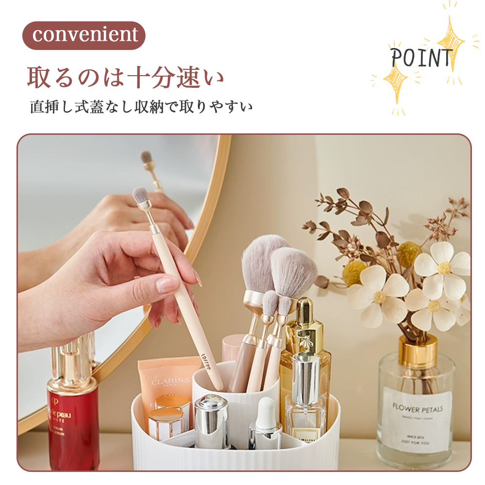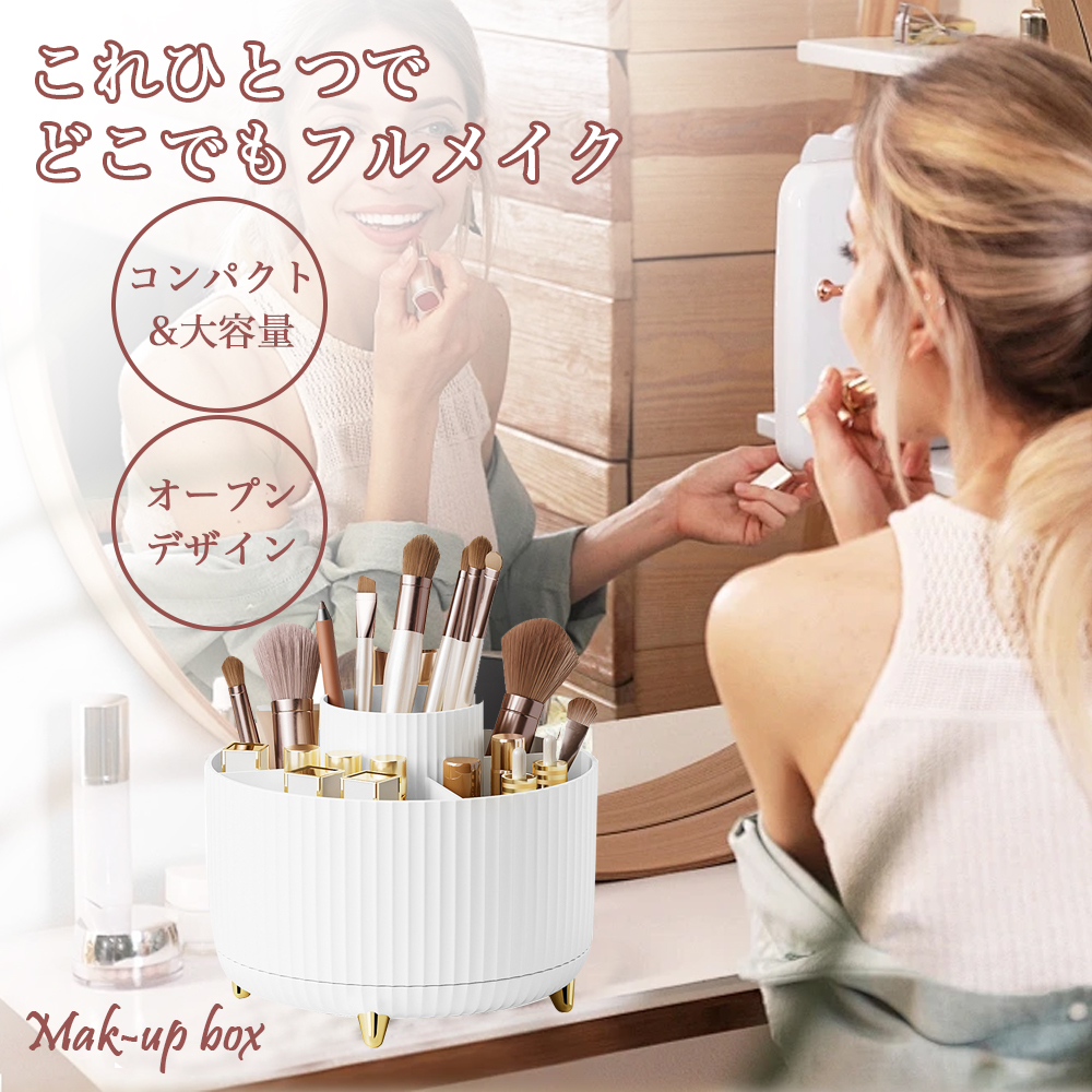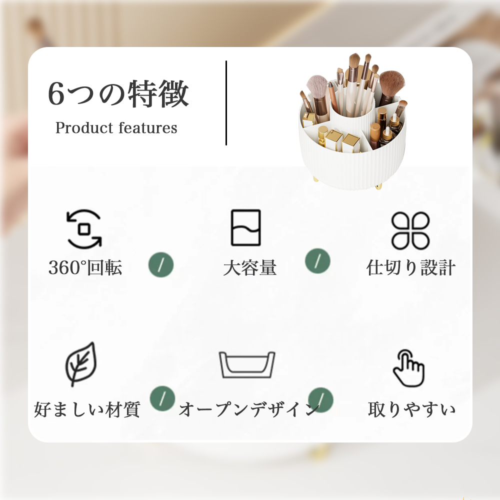 【回転式デザイン】360°回転式で、取り出しやすい。細かく仕切られている上部プレート、コスメやメイク道具など小物を整理して収納できる便利な卓上収納。