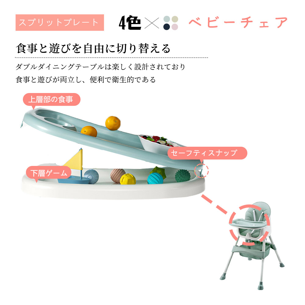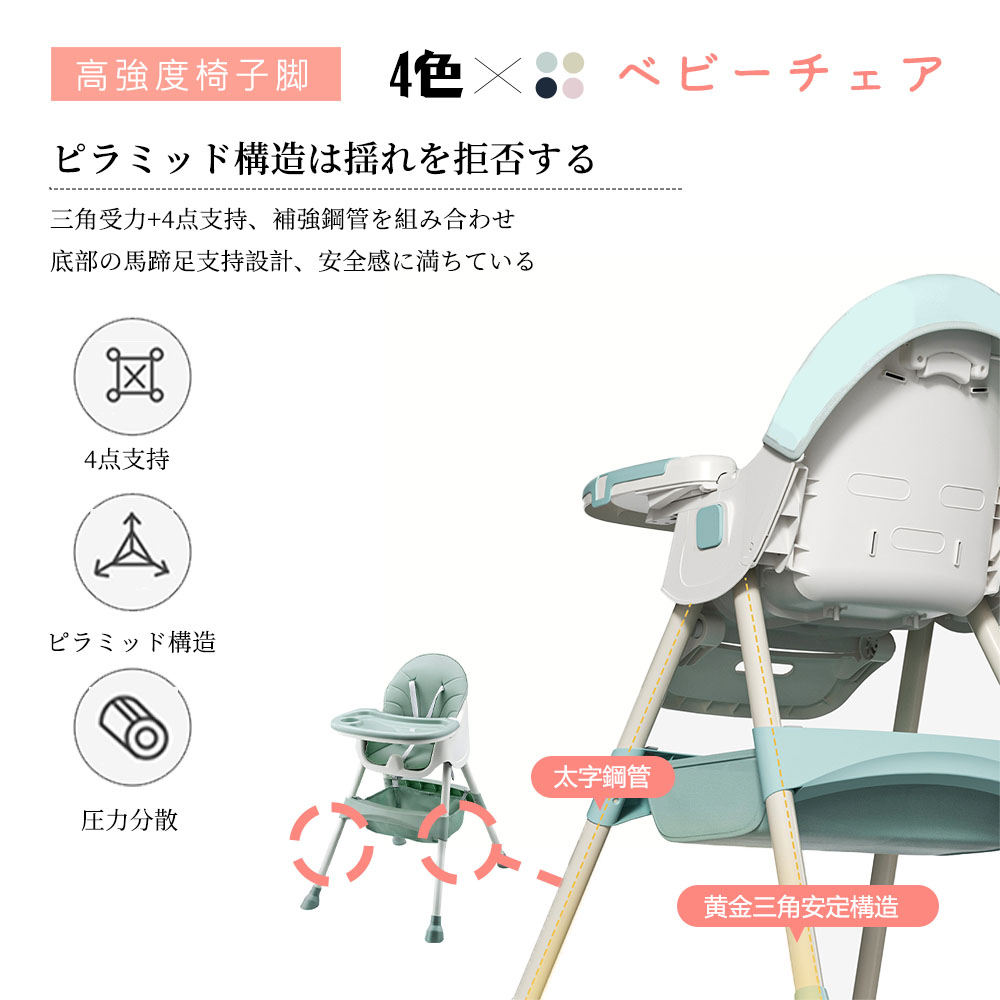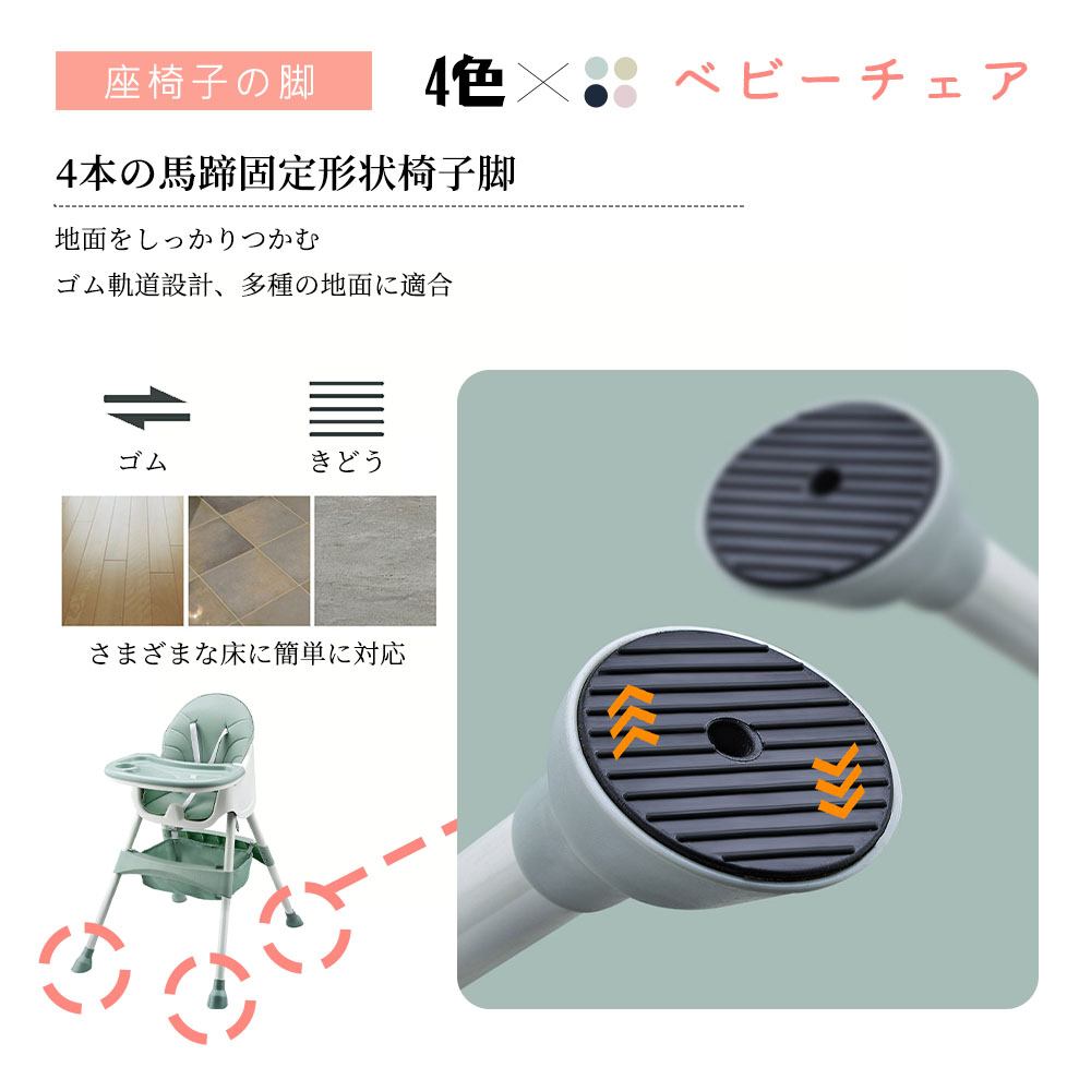 2.工具不要でハイチェア 、ローチェアの2wayで使える。 2タイプ・多機能ハイローチェア:足の調節 でハイチェアにもローチェアにも変身できる一台二役の 機能的ダイニングチェア。また、ハイチェアとローチェアの 両モードにそれぞれキャスターを取り付けることができ、 移動便利です!5カ月頃から4歳頃まで長くお使いいただけます。