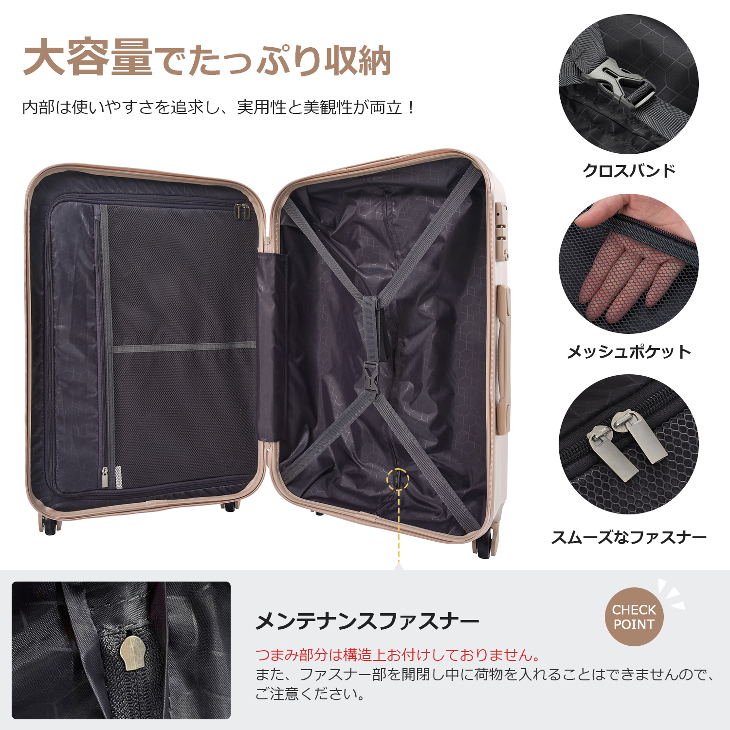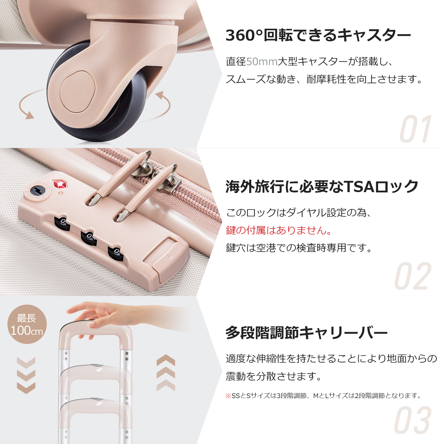 10.【ご注意】①内部ファスナーについて:ケース内部にあるファスナーはメンテナンス専用ファスナーとなります。修理が必要になった場合にのみ使用するファスナーのため、あえてファスナーのつまみが付いていません。お荷物を入れるものではありませんので、ご注意ください。②SSとSサイズは寸法のため、側面のハンドルと底足が付いておりません。予めご了承ください。③※掲数している写真は、ご使用のコンピューター及びスマホのモニターの種類によって、実際の商品のイメージと多少異なることがございます。予めこ了承ください。※ロットによって、製品の色は多少異なりますので、こ了承とこ理解の程よるしくお願いたします。