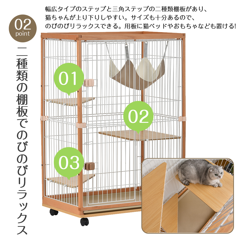 猫 ケージ キャットケージ 2段 木製フレーム ハンモック付 広々 大型 猫ゲージ 高級感 おしゃれ キャットハウス ネコ ハウス 多段 留守番 脱走防止 多頭飼い 多頭 スチール ペットケージ【ナチュラル】 TX294087AAA