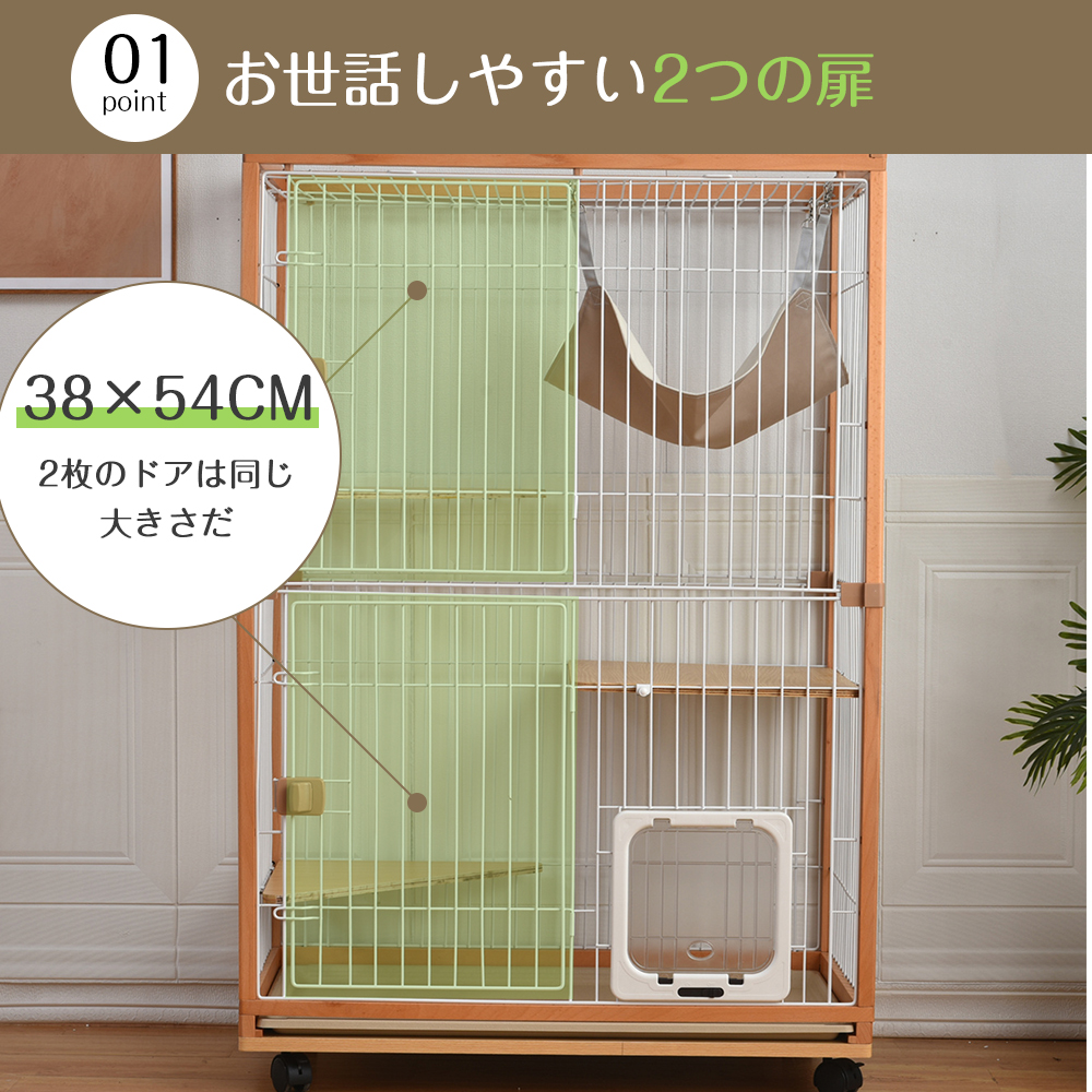 SKU:TX294087 Title 猫 ケージ キャットケージ 2段 木製フレーム ハンモック付 広々 大型 猫ゲージ 高級感 おしゃれ キャットハウス ネコ ハウス 多段 留守番 脱走防止 多頭飼い 多頭 スチール ペットケージ Dimensions & Details ・素材 無垢材フレーム ・カラー ナチュラル ・商品サイズ 幅85.5cm×奥行き54.5cm×高さ128cm ・梱包数 1 ・梱包サイズ 87*25*64CM ・重量(N.W.) 20KG ・重量(G.W.) 22KG ・生産国 中国 ・組立品/完成品 組立品 ・耐荷重 棚板1枚あたり15kg Features この商品について: ◎01 こんな時に大活躍キャットケージ ◎02 猫ちゃんの安全を守って、飼い主も安心! ◎03 無垢材フレームでもっとしっかり ◎04 二種類の棚板でのびのびリラックス ◎05広々としたスペースで窮屈しない ◎06つまみタイプのドアがいたずらしにくい ◎07猫ドア付き、出入り自由 ◎08ゆったりくつろげるハンモック付き ◎09掃除しやすいトレイ ◎10キャスター付きで移動ラクラク 商品の説明: ◆01こんな時に大活躍キャットケージ 1 出かける時 お留守番時に、子猫の安全を守る。 2 多頭飼いの時 けんか防止用。最初の仲悪い時期に猫たちを分離して冷静にする。 3 猫の運動不足を解消したい時 二段と三段のケージで上下運動できる。 4 猫が病気になる時 世話しやすい構造。他の子とも距離を保つ 5 お料理中やお食事中 いたずら防止やテーブルに上がるのを防止する。 ◆02猫ちゃんの安全を守って、飼い主も安心! 1無垢材フレームでもっとしっかり 2二種類の棚板でのびのびリラックス 3広々としたスペースで窮屈しない 4つまみタイプのドアがいたずらしにくい 5猫ドア付きて出入り自由 6ゆったりくつろげるハンモック付き 7掃除しやすいトレイ 8キャスター付きで移動ラクラク ◆03無垢材フレームでもっとしっかり フレームは欅の木で、全て天然木(無垢材)を使用しており、一般的なケージに比べ質感・耐久性に優れ、揺れることや崩れることの問題を解決し、全体がもっと安定してしっかりしている。 木のぬくもりやカラーによって、ナチュラルインテリアが、可愛らしくもおしゃれな雰囲気をかもし出してくれる。 ◆04二種類の棚板でのびのびリラックス 幅広タイプのステップと三角ステップの二種類棚板があり、猫ちゃんが上り下りしやすい。 サイズも十分あるので、のびのびリラックスできる。 棚板に猫ベッドやおもちゃなども置ける。 ※棚板の耐荷重は15kgで、大型猫や多頭飼いでも安心! ◆05広々としたスペースで窮屈しない 多頭飼いさんにも便利に使える余裕サイズ、広々とした空間で自由自在。 2段タイプ:2~3匹 3段タイプ:3~4匹 注意: ※猫ちゃんがケージに慣れない場合は猫のお気に入りものを入れるのがおすすめ。 ◆06つまみタイプのドアがいたずらしにくい ロックをつまむだけの簡単開閉、猫ちゃんが中で開けることも無理なので、安心できる。 ケージをこじ開けて脱走した猫へのよい対策。 ◆07猫ドア付き、出入り自由 3つ設定でペットの出入りが自由自在 ON状態:出入りができる。 ONとOFFの間:入るのはできるが、出るのはできない。 OFF状態:出入りができない。 ◆08ゆったりくつろげるハンモック付き ゆらゆら揺れる居心地の良さ。 フック式なのでケージのお好きな場所に設置ができる。 ◆09掃除しやすいトレイ 引き出しのようなトライで、出し入れが簡単で掃除しやすい。 スペースも十分あるので、トレイにネコソファ、ネコトイレ、食器台などをどんどん入れてもOK! 注意: ※トレイの材質はプラスチックなので、白っぽく見える場合がございます。不良品ではないので、ご了承ください。 ◆10キャスター付きで移動ラクラク スムーズに移動が行えるキャスター付き。 ロック機能があり、安全にご使用いただける。 お掃除もラクラク Attention ご注意: ※お客様組み立て品となります。 ※本商品の組み立てやご使用に際しては、乱暴に扱いますと損害やケガの原因となりますので、丁寧にお取り扱いください。 ※商品デザインは、品質に差し支えない程度に、予告なく変更する場合があります。