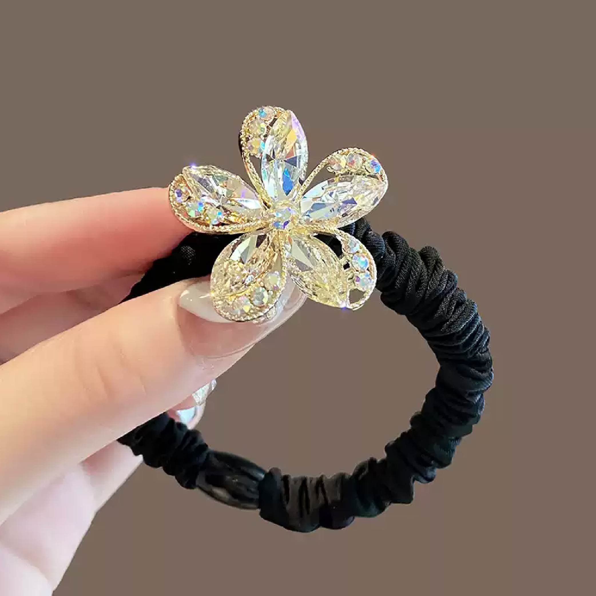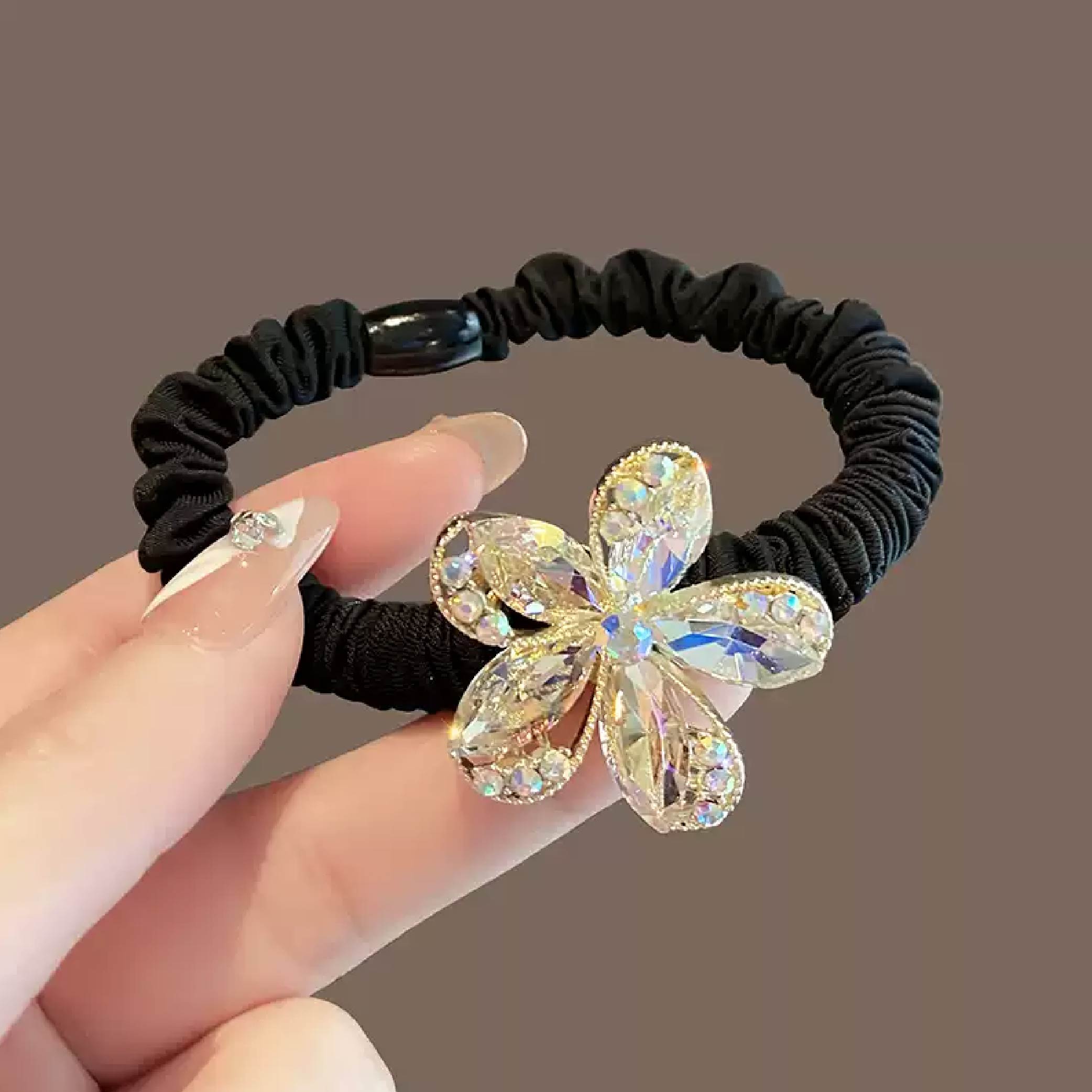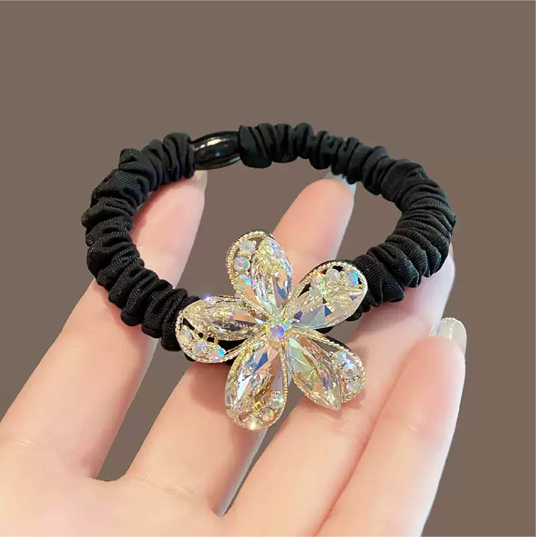 キラキラと煌めくストーンを埋め込んだフラワーモチーフのヘアゴムです。美しいツヤ、上質、髪にやさしく、丈夫で柔らかく、髪に跡が残りません。