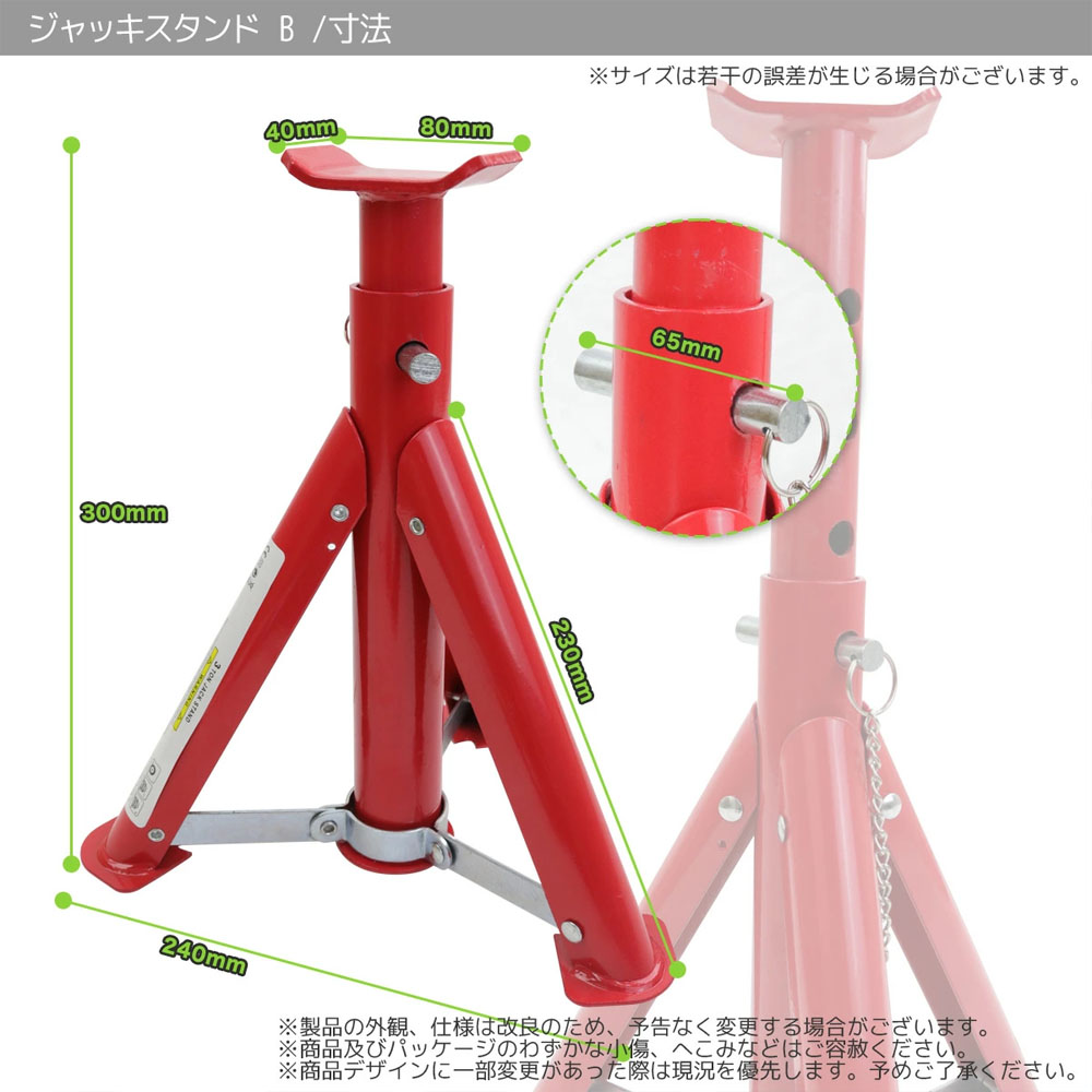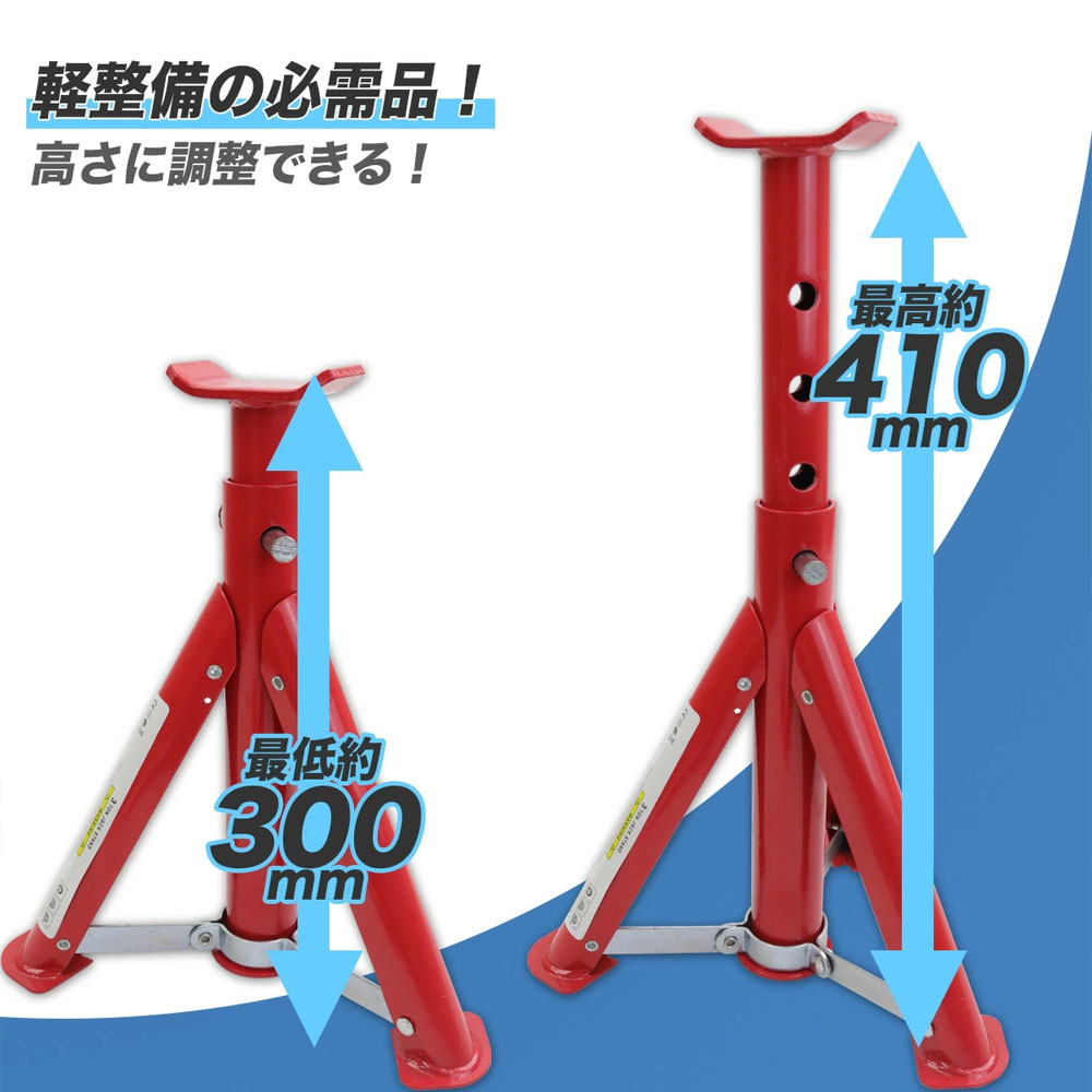 ジャッキスタンドB 2基セット 耐荷重3t / リジットラック 馬ジャッキ ジャッキアップ 整備 /折畳み式/耐荷重:3t (2基使用)/最低位:300mm/最高位:410mm /高さ調整:4段階(ピン式) L0509750