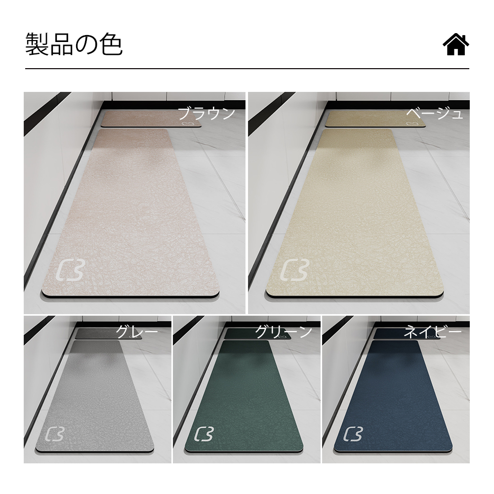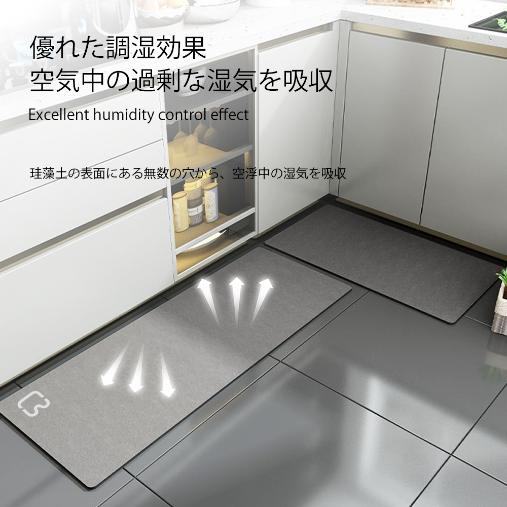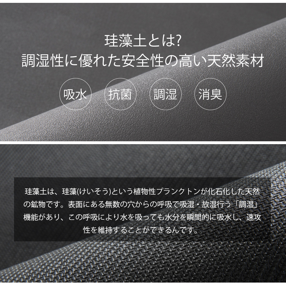 珪藻土の持つ優れた吸水性で、湯上りの濡れた足の裏の水分をすばやく吸い取ってくれます。 カビや嫌な匂いが発生しにくい。 影干ししておくだけで、カビの発生が防げる特徴があり衛生的で手間要らず!! お手入れに手間がかかりません! |